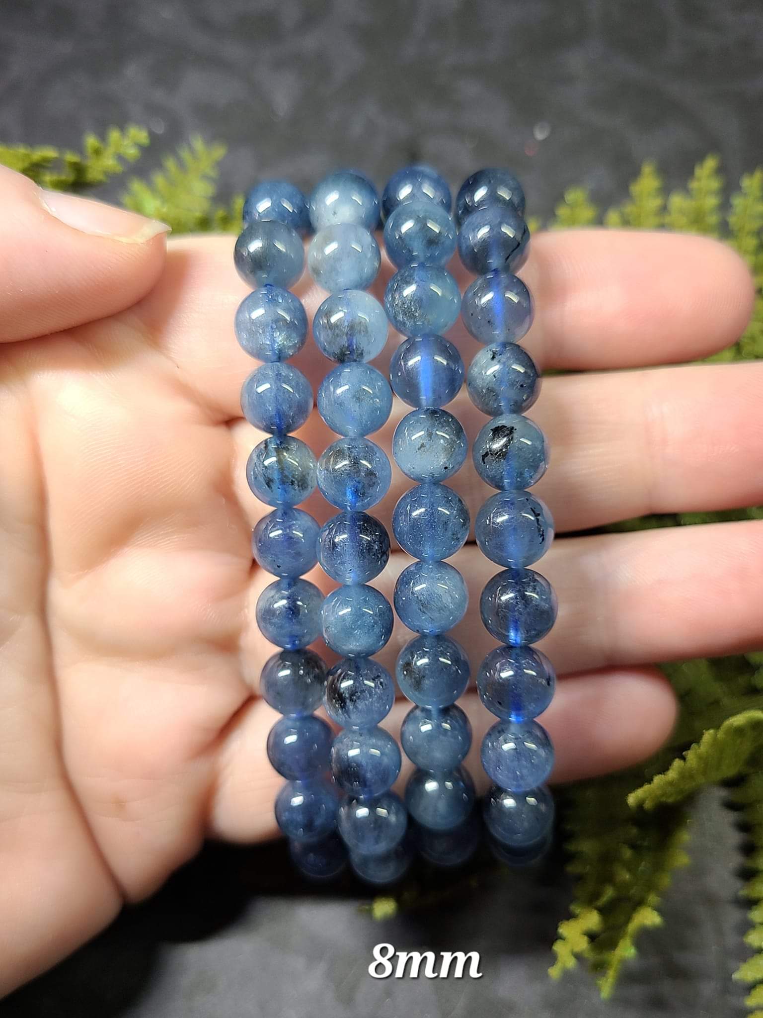 These stunning deep blue aquamarine bracelets feature some black tourmaline inclusions, combining the serene and calming ocean-like properties of aquamarine with the grounding protection of black tourmaline. Wear these bracelets to ease and protect yourself through these wild and trying times.