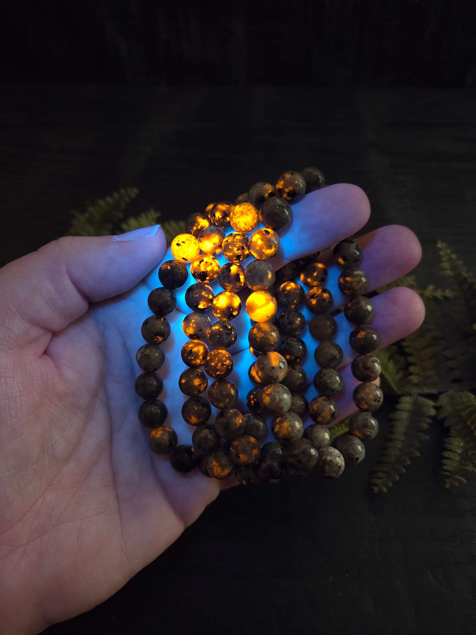 Yooperlite is a trademarked trade name for this stone, though it's becoming more commonly known as emberlite due to the trademark owner. It is a rock found commonly on the beaches in northern Michigan (discovered around 2017) and can also be found in Madagascar. They look like gray rocks to the naked eye, but the mineral composite makes the rocks glow under ultraviolet light. When exposed to UV lighting, the Inclusions within these stones light up like fire is bursting from within!