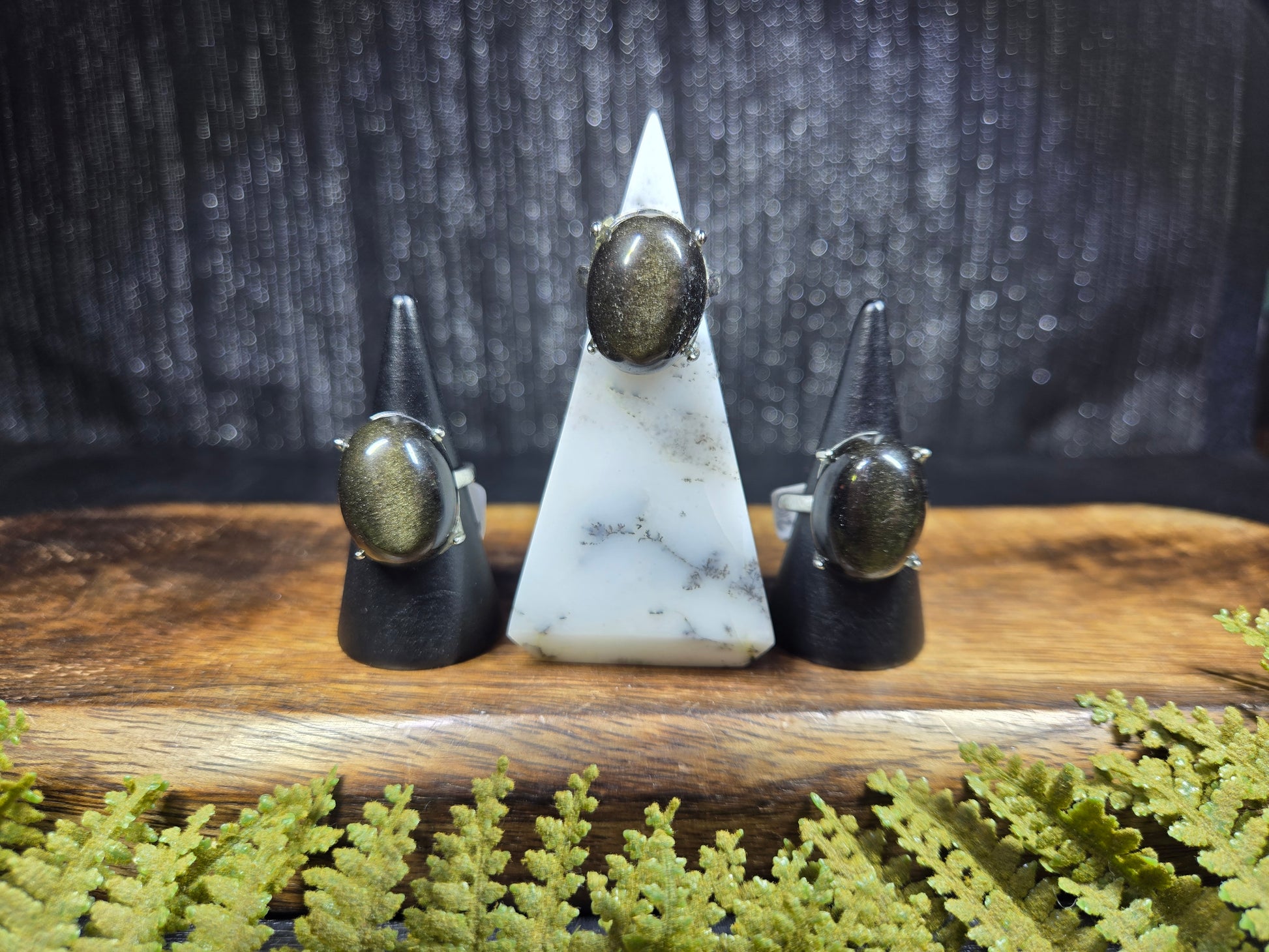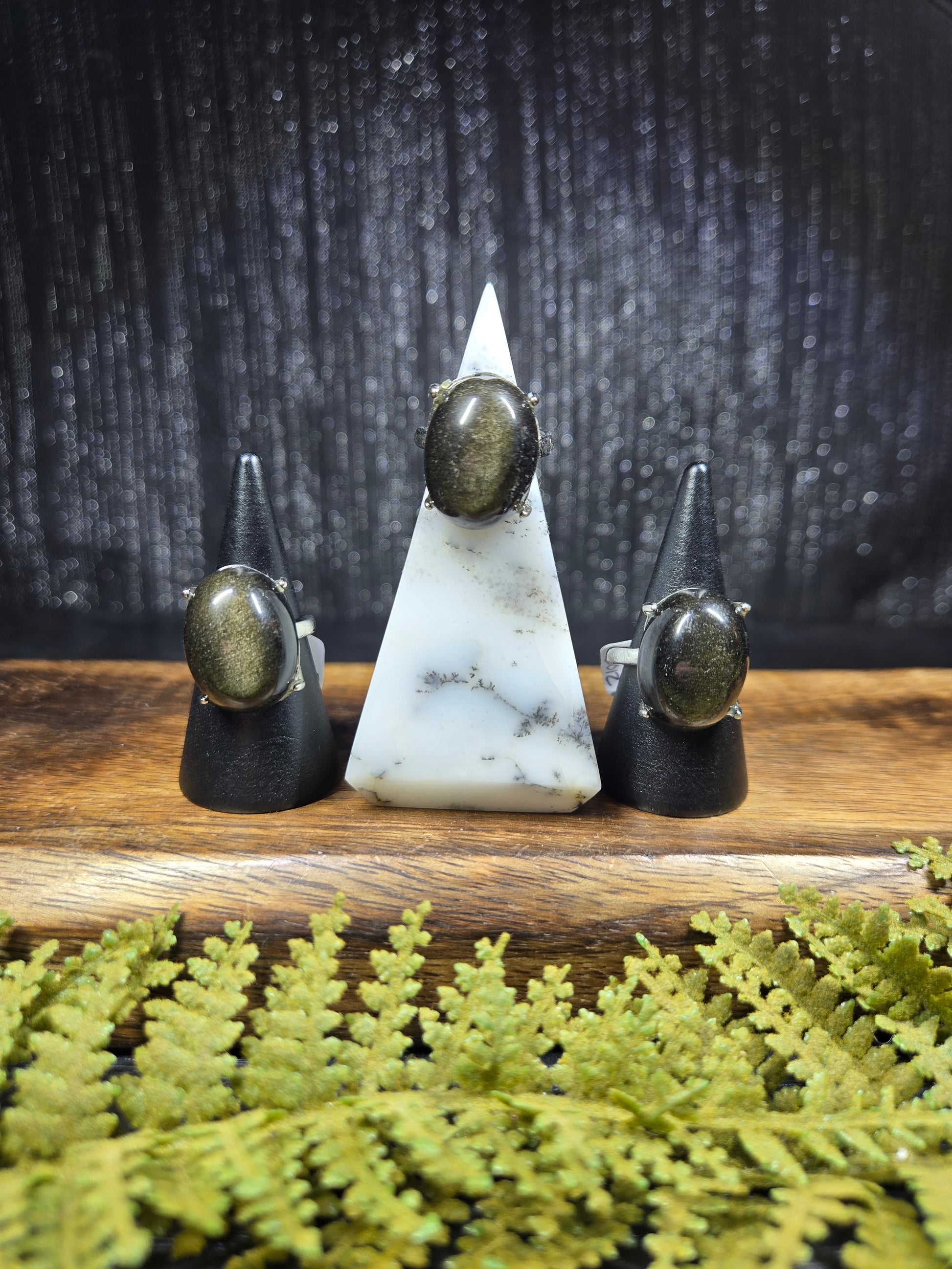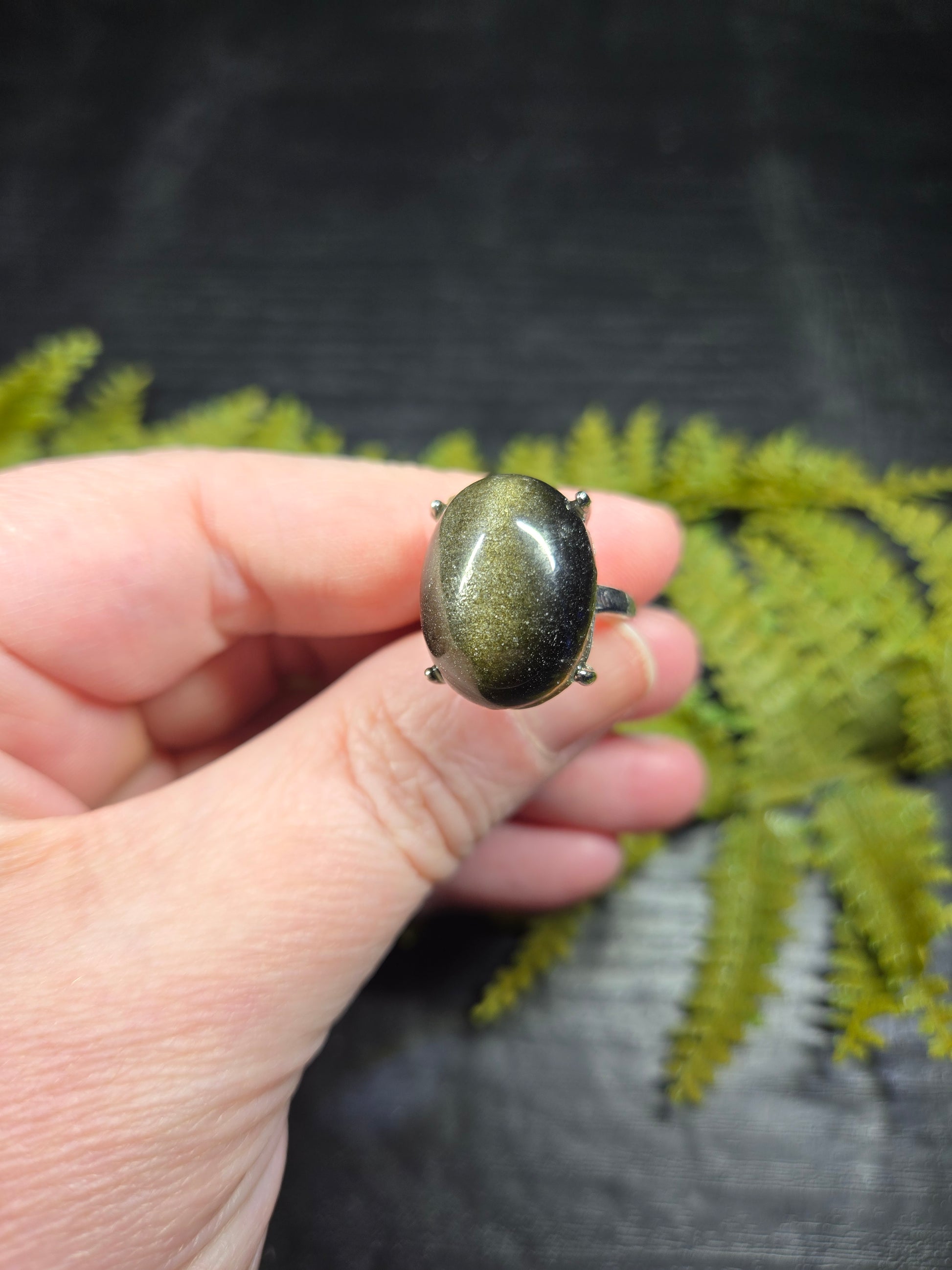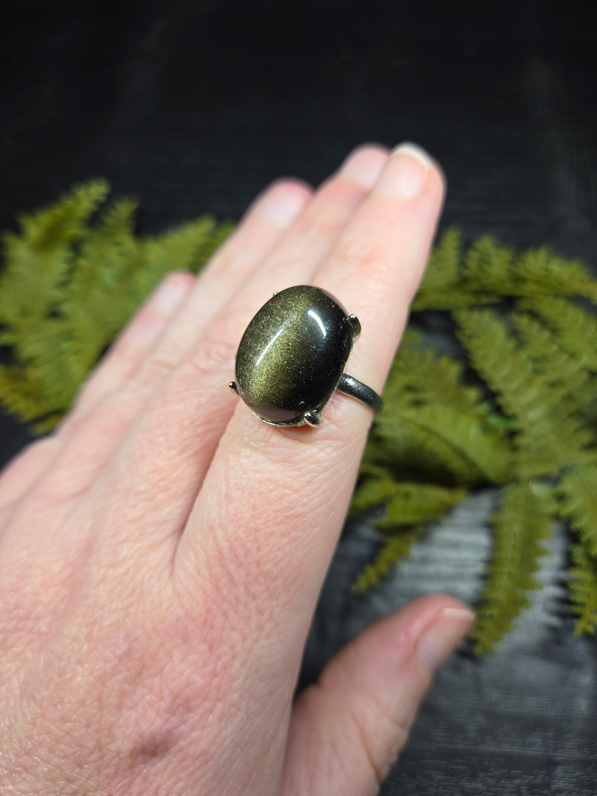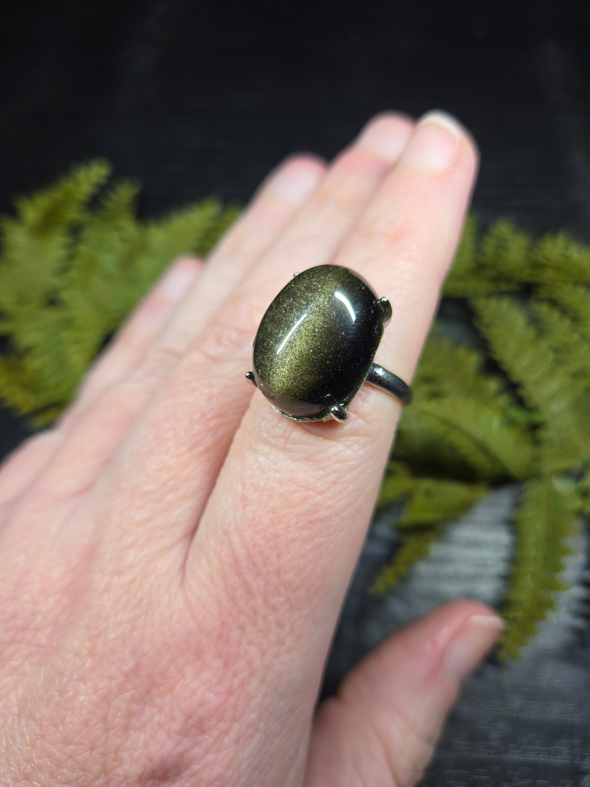 These adjustable rings are wildly accommodating in size, and feature an extra large gold sheen obsidian cabochon! They are such a size that they could even be used as a portable gazing stone for scrying on the go.