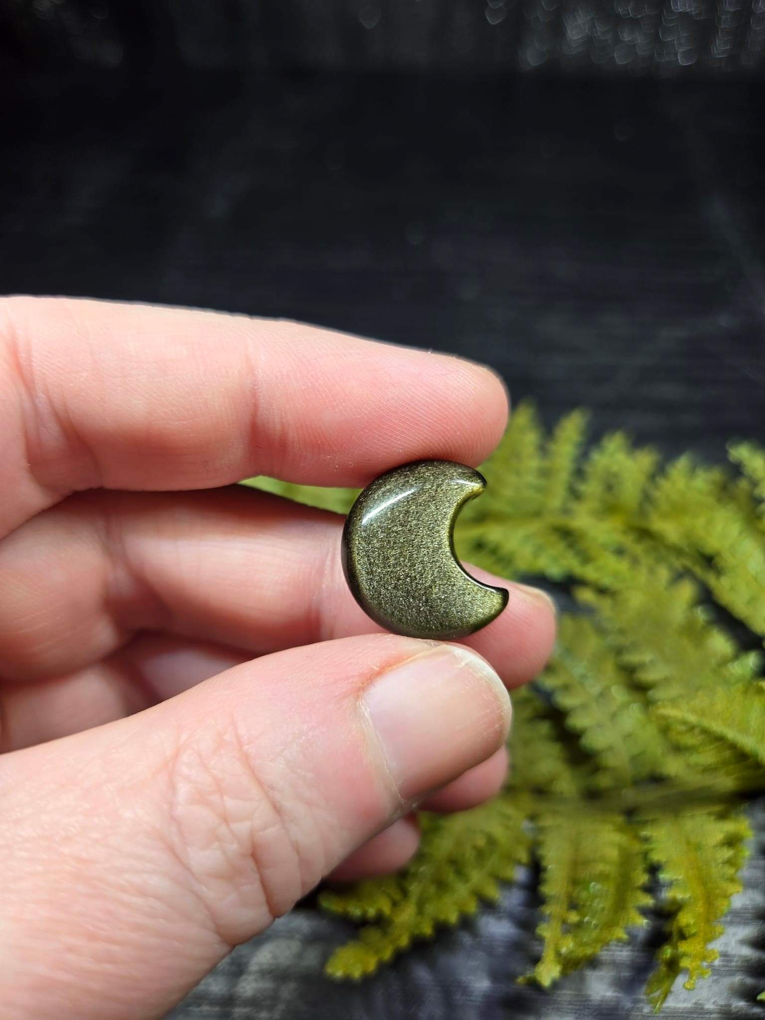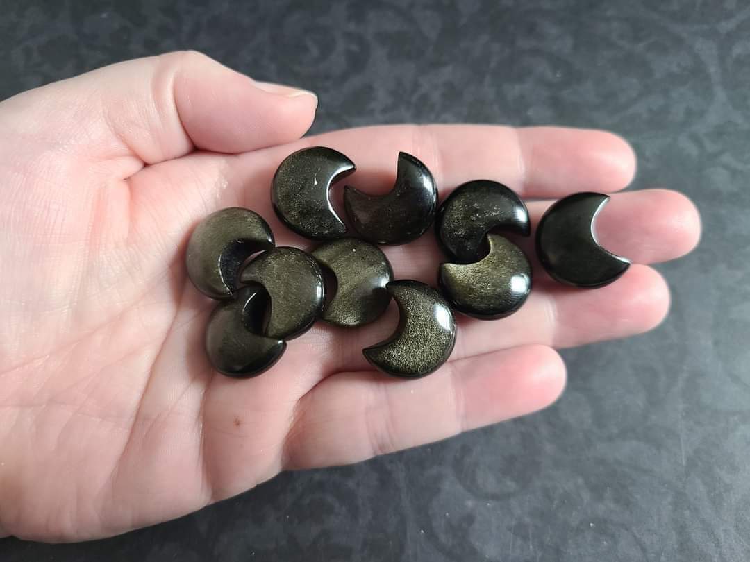 Hold a piece of the night sky with these gold sheen obsidian tiny celestial carvings! Each one is filled with golden shimmer, perfect for your jewelry making, spell jar making, or even as offerings to deities. They are an excellent size for wire wrapping!