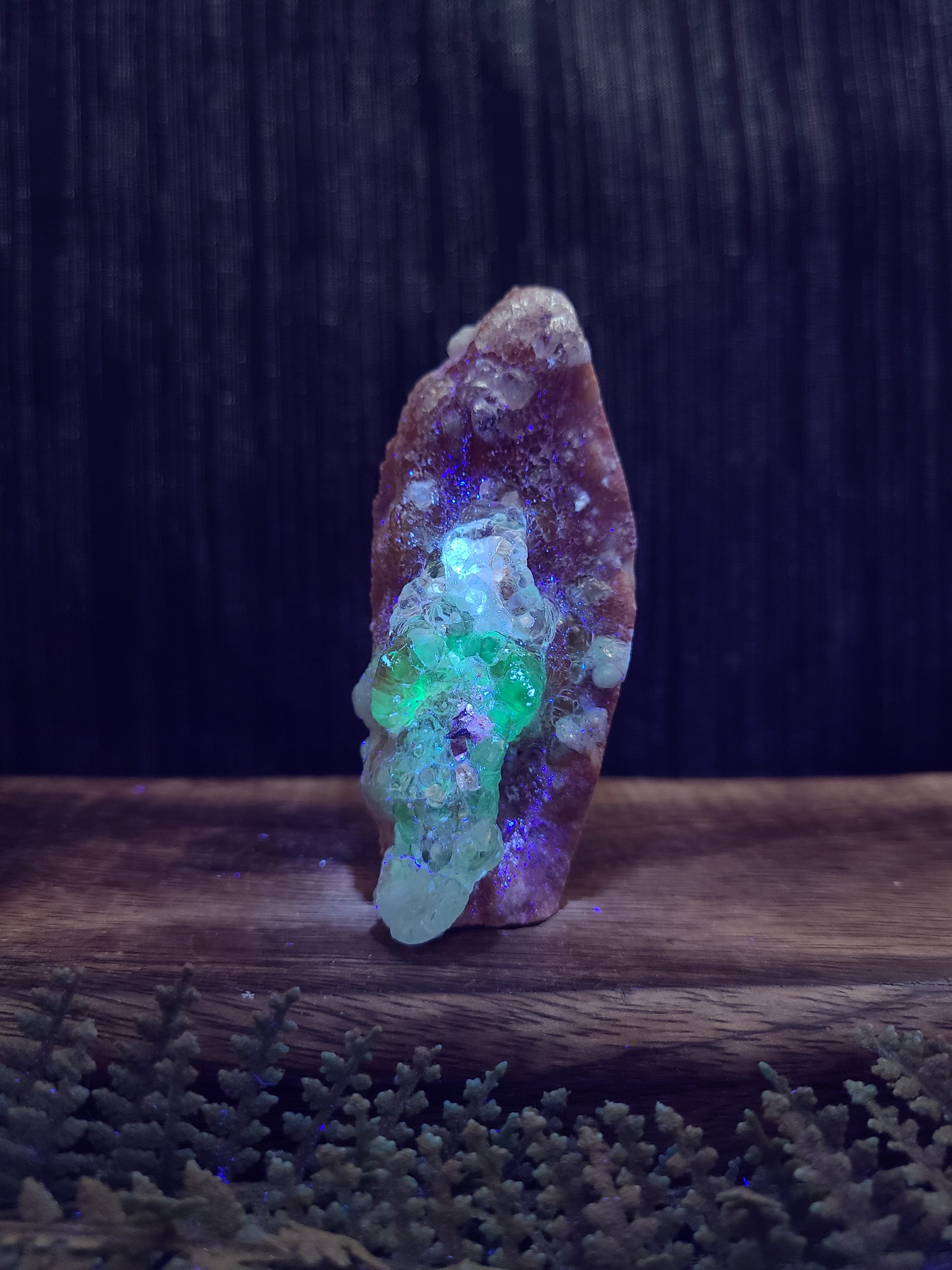 Thanks to the high quality of these pieces, they react well with short or long wave UV. Due to the rarity of these pieces, I highly suggest museum gel or mineral putty to secure them to the shelf surface you choose to display them on.