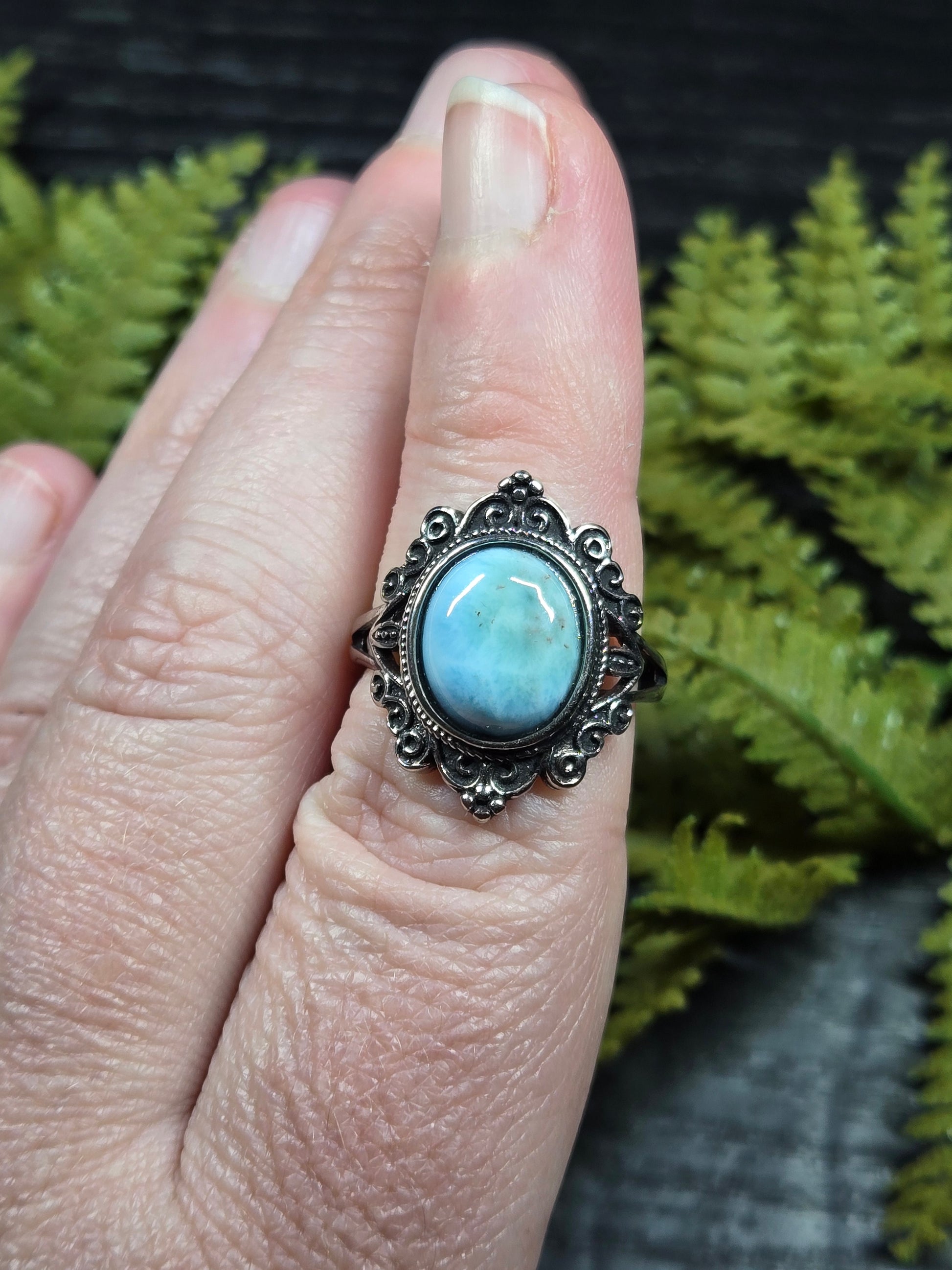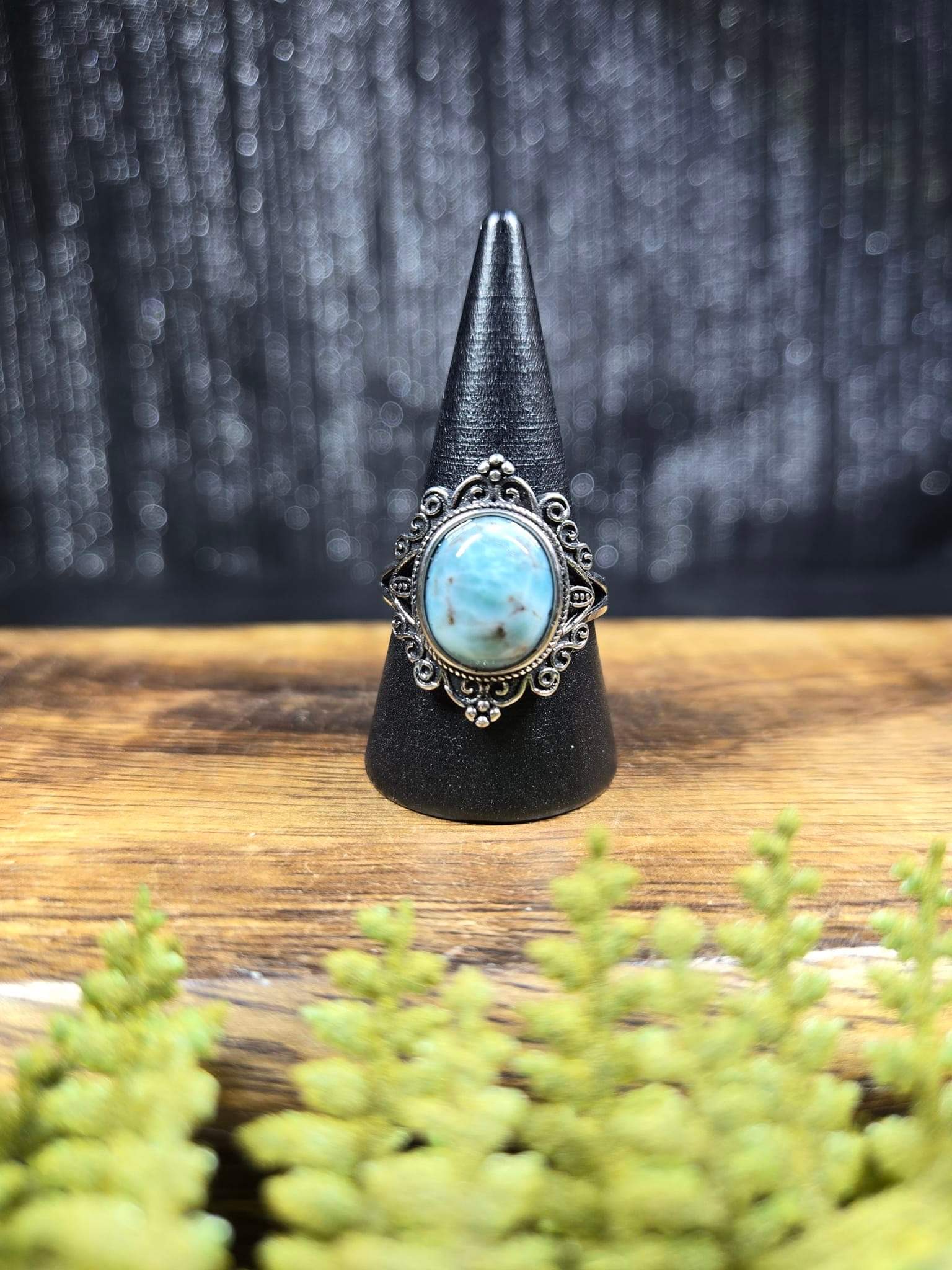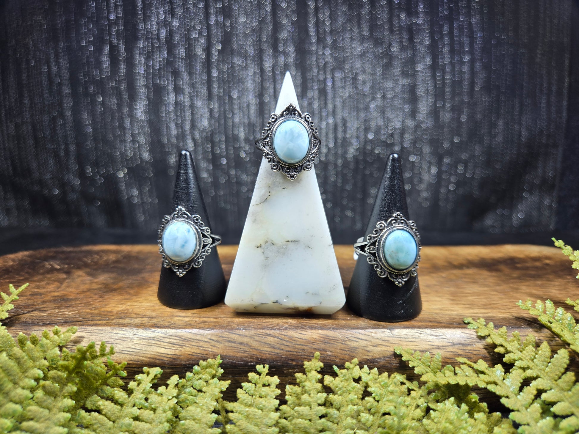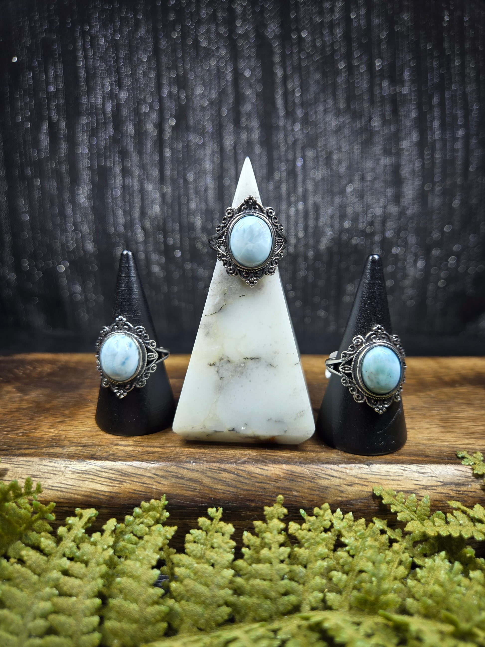 Larimar is one of the cardinal Water element stones, yet is born of Fire in its volcanic origins. It is the stone of the ocean, mined solely in the Dominican Republic in mines that become repeatedly flooded by the powerful waters there. It is a stone that mimics the colour, pattern and feel of the ocean. These gorgeous, antique style rings are an inexpensive way to carry the ocean with you anywhere! Wear this to promote the ability to overcome anything, while remaining calm and relaxed.
