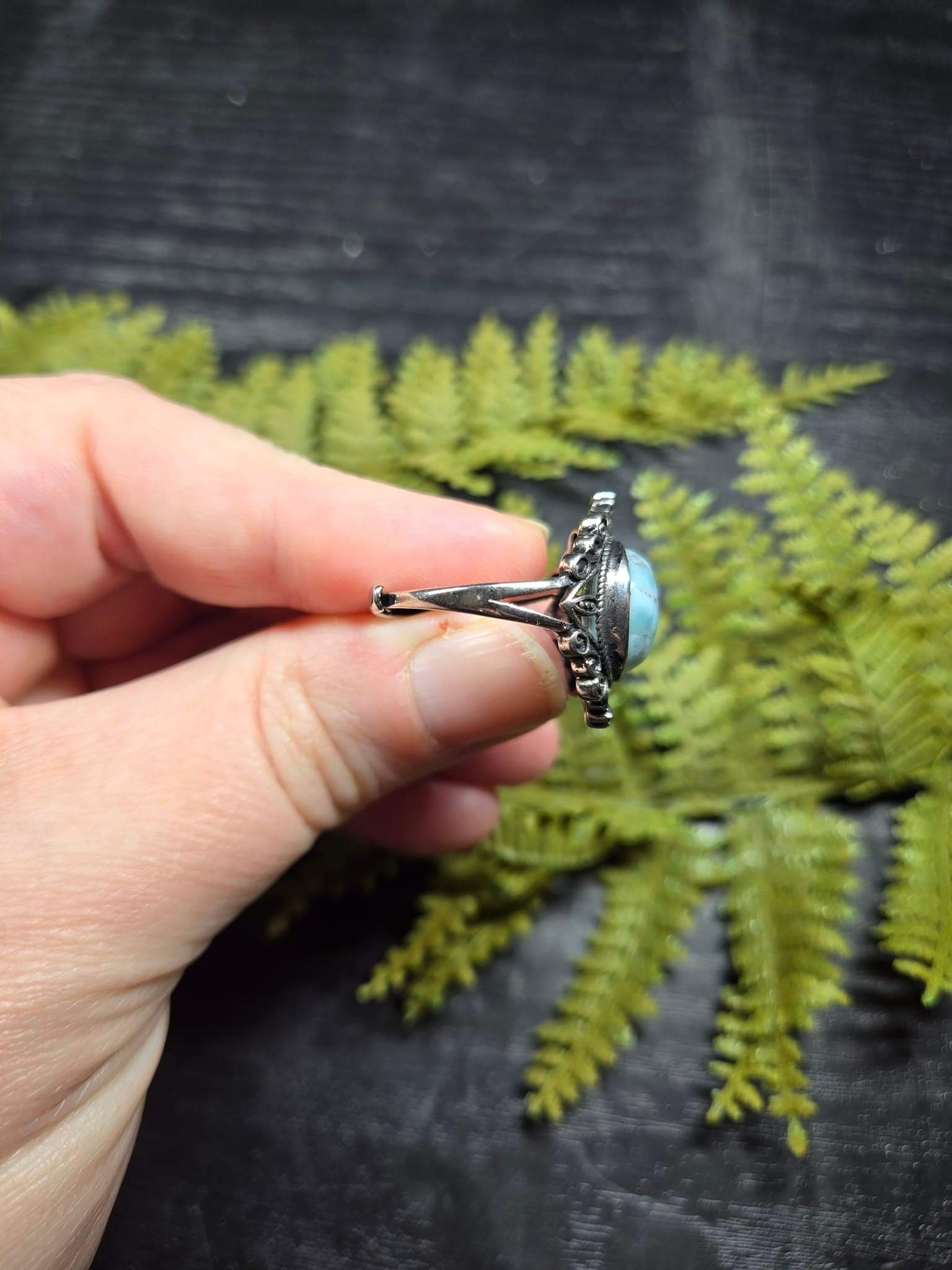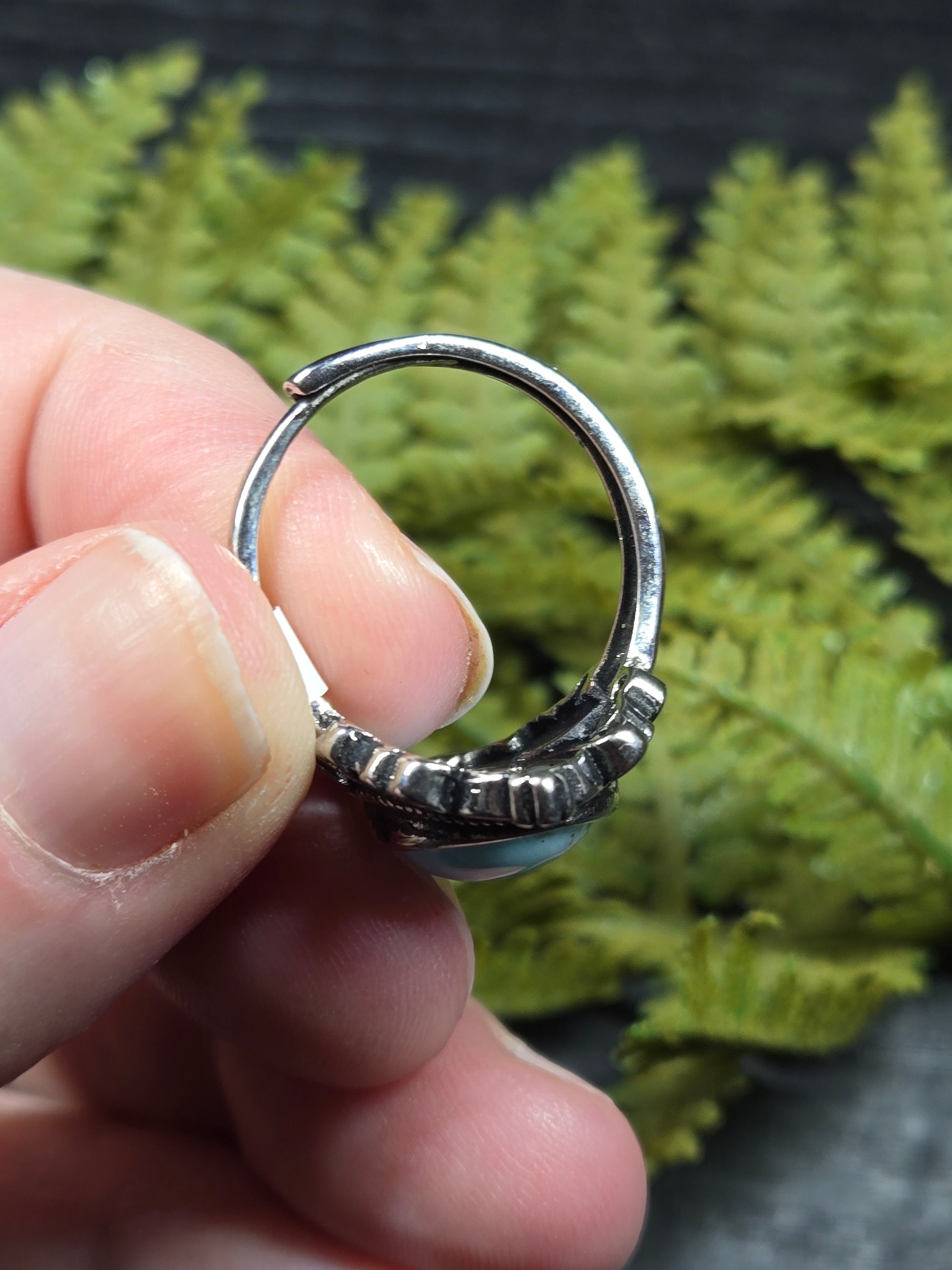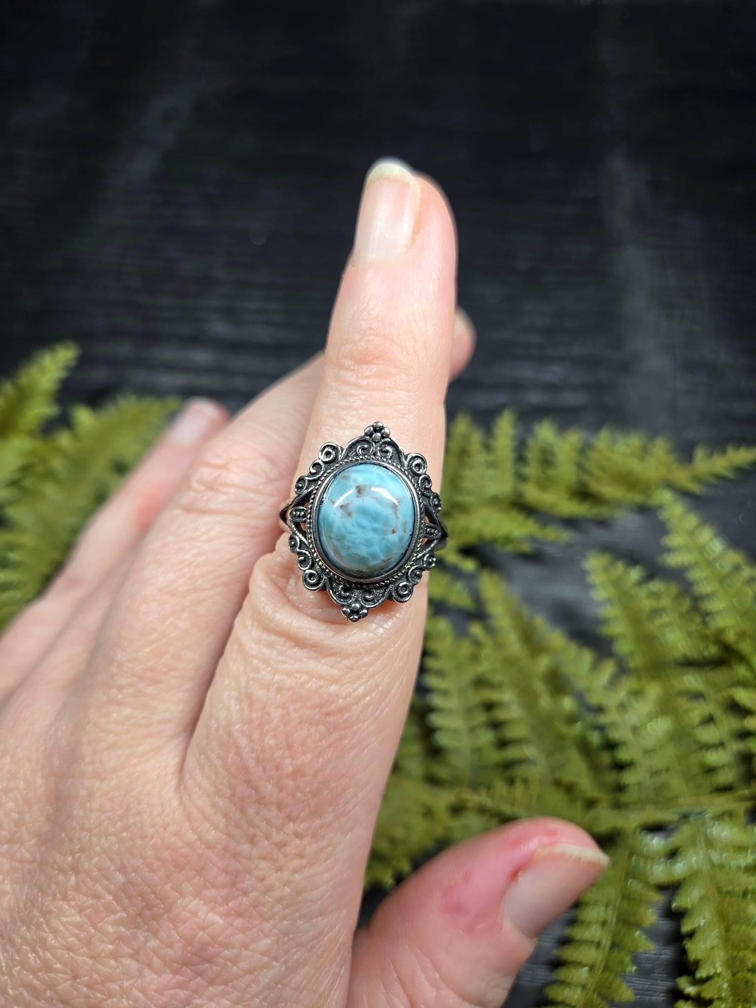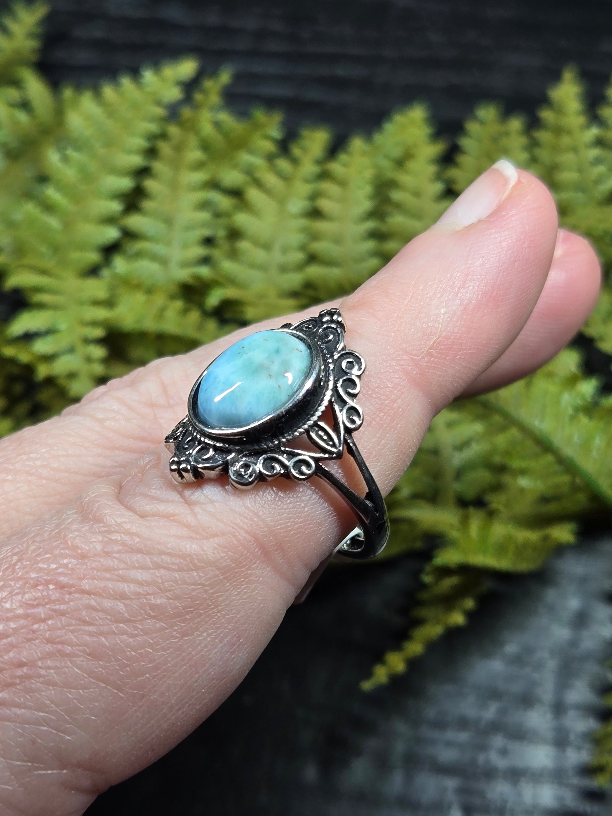 Larimar is one of the cardinal Water element stones, yet is born of Fire in its volcanic origins. It is the stone of the ocean, mined solely in the Dominican Republic in mines that become repeatedly flooded by the powerful waters there. It is a stone that mimics the colour, pattern and feel of the ocean. These gorgeous, antique style rings are an inexpensive way to carry the ocean with you anywhere! Wear this to promote the ability to overcome anything, while remaining calm and relaxed.