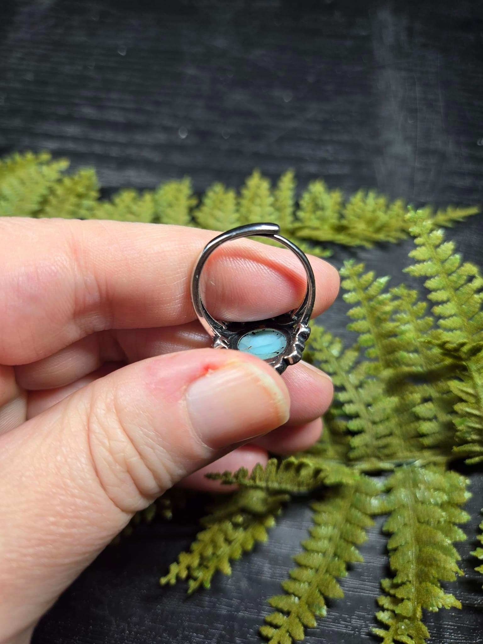 Our adjustable rings are sterling over nickel free base. These have a beautiful oval cabochon of larimar set in an antique frame design.