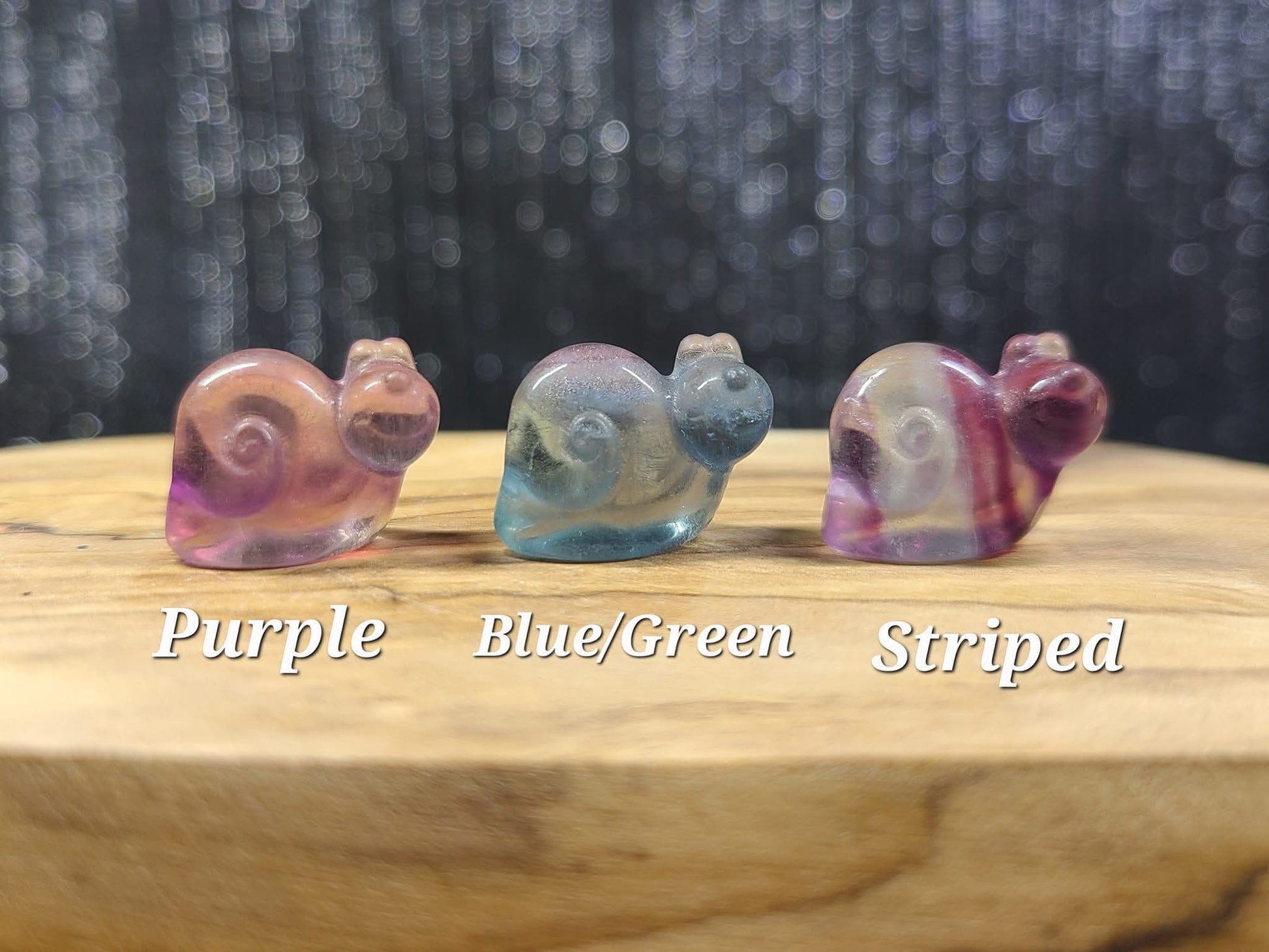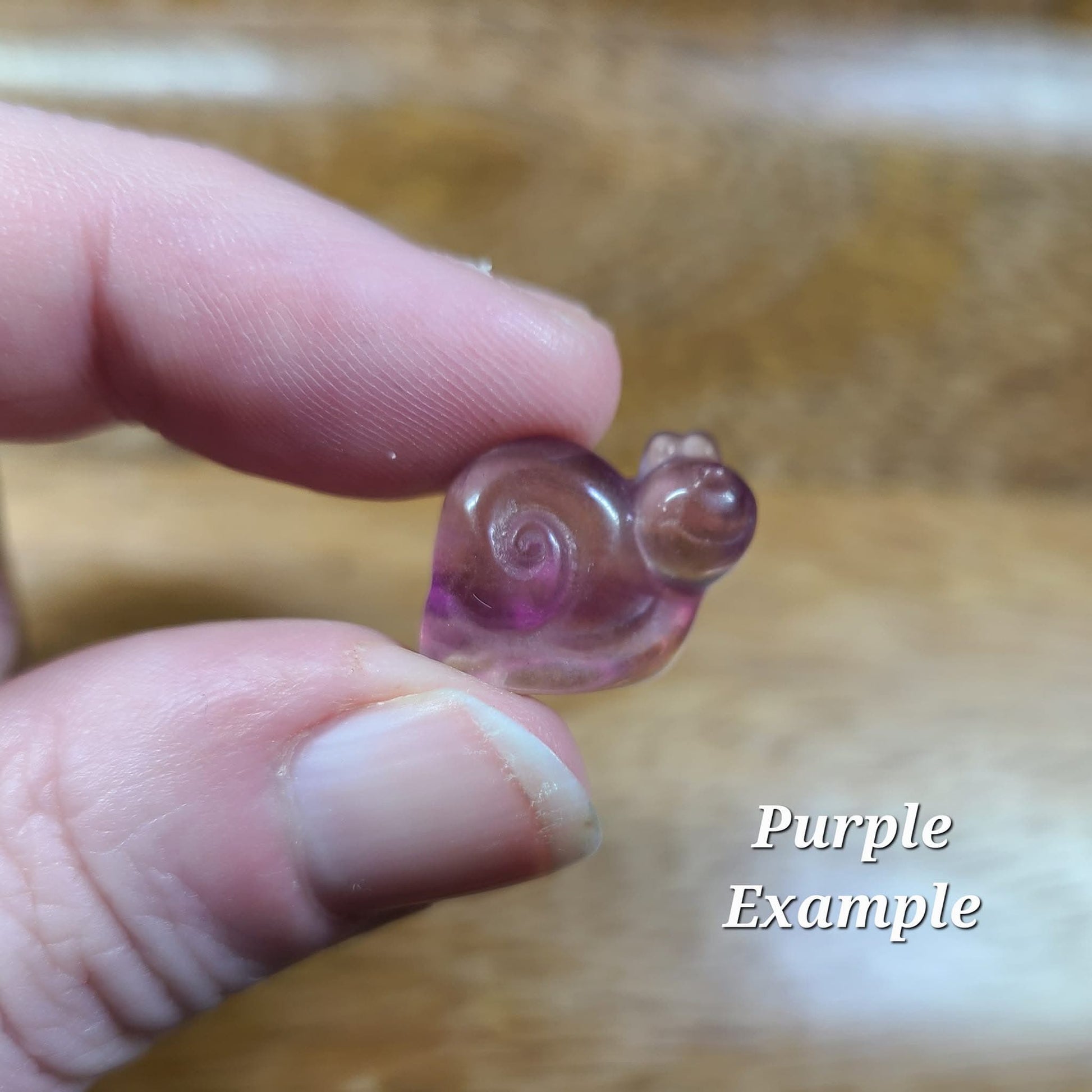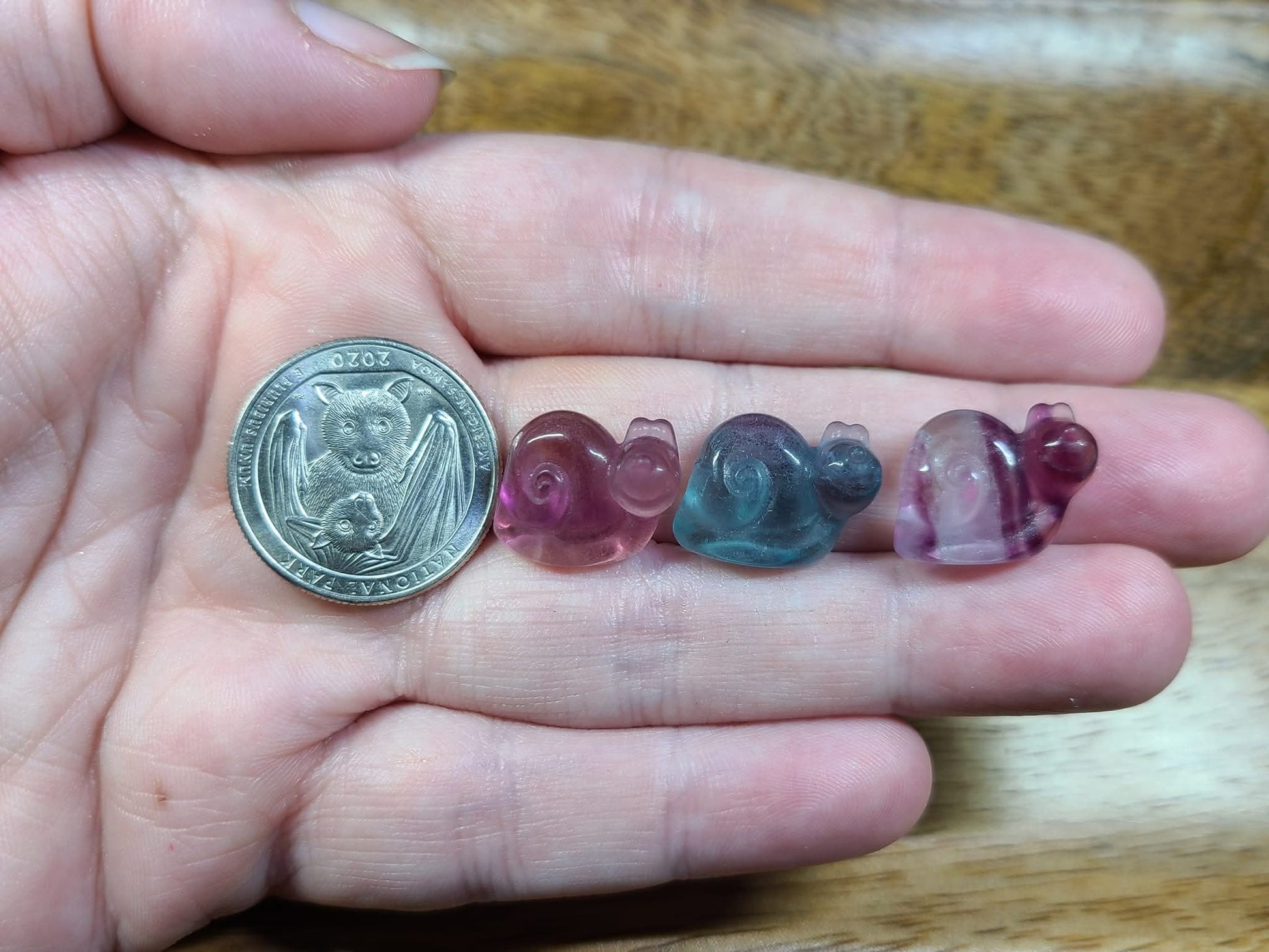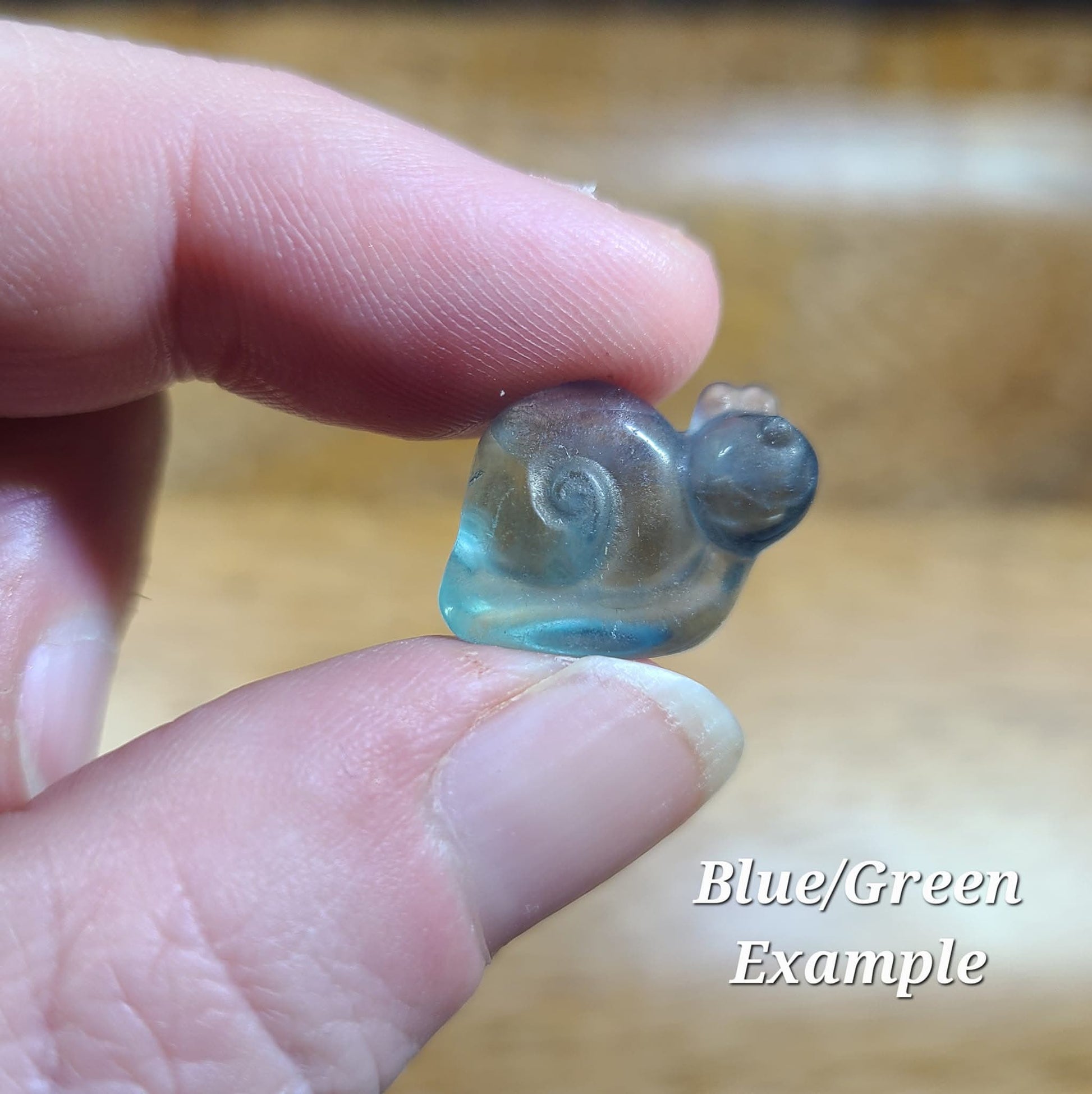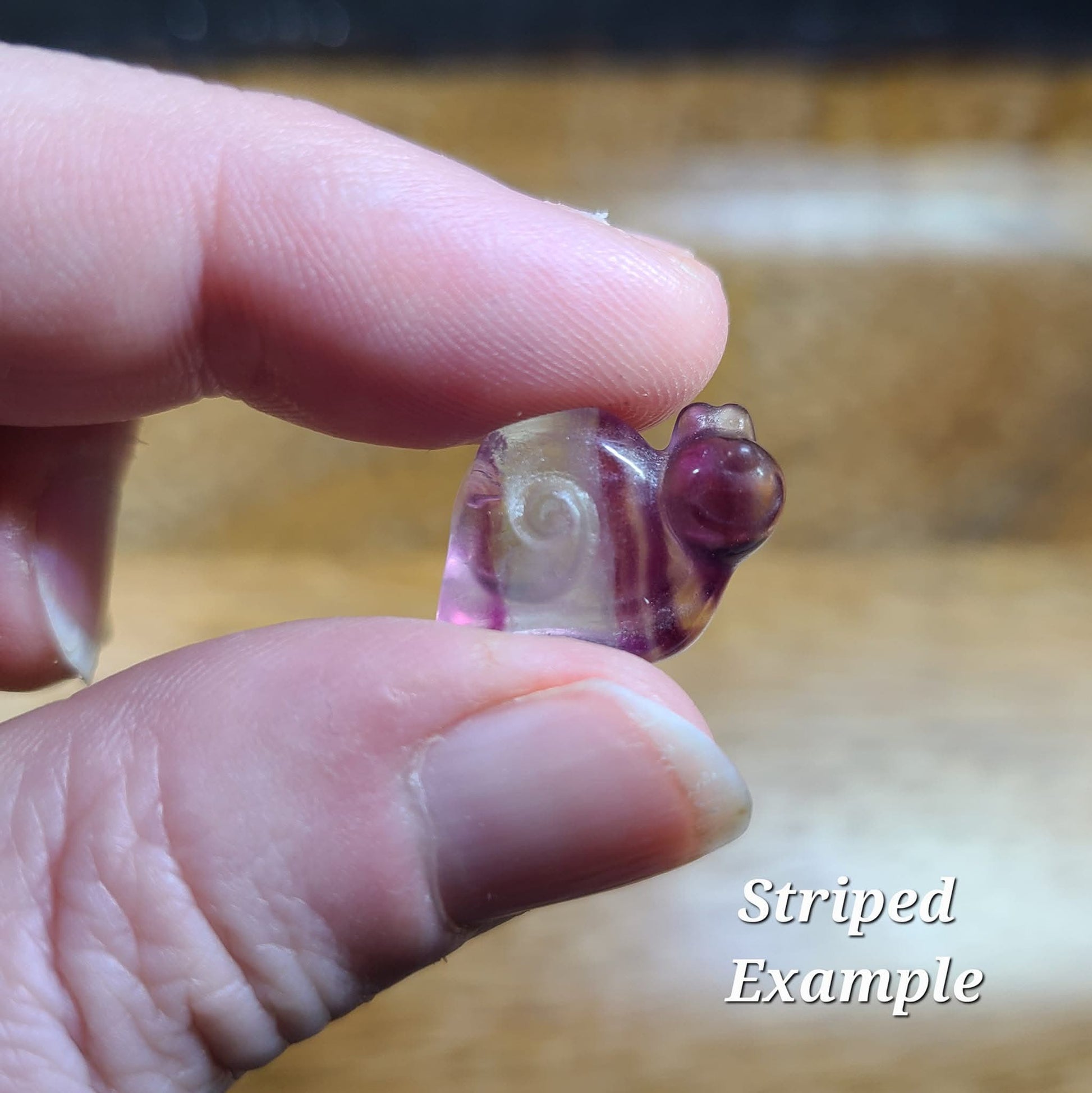 These itty bitty snails have the cutest faces on them! They are smiling in anticipation for spring. While they shouldn't live in your real plants (fluorite and water don't mix well), these would be adorable in your faux plants or crystal terrariums! Just be careful as fluorite will fade with prolonged sunlight exposure.