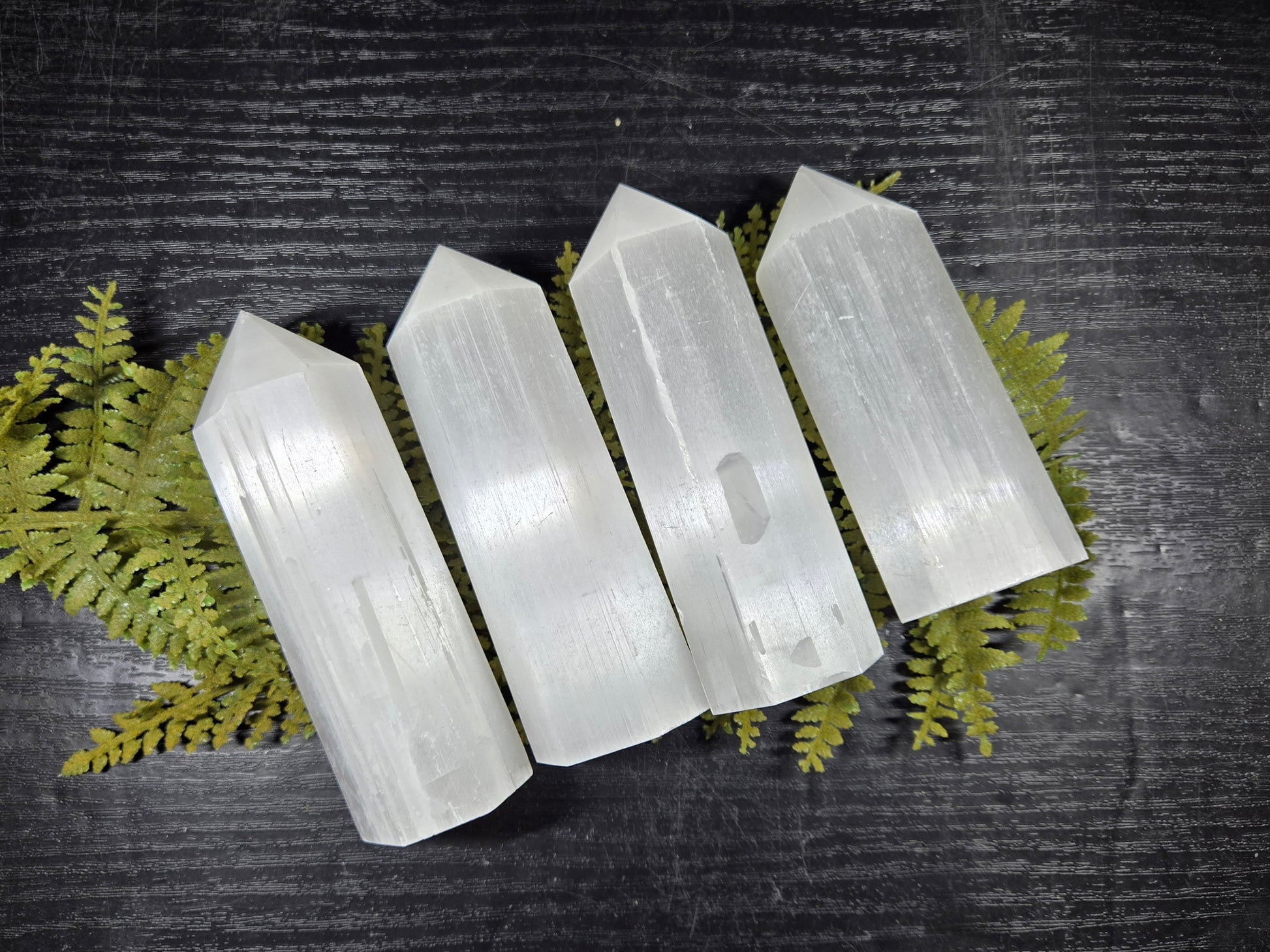 Satin spar/selenite is often used to cleanse and charge crystals. Leave near or on a collection of crystals for 24h and this will help to cleanse and charge them! Some folks even wrap their bracelets around these towers.