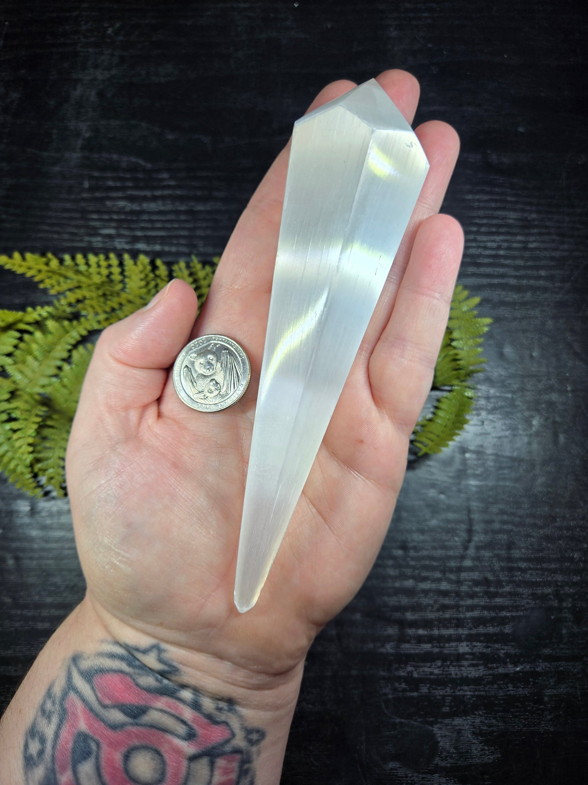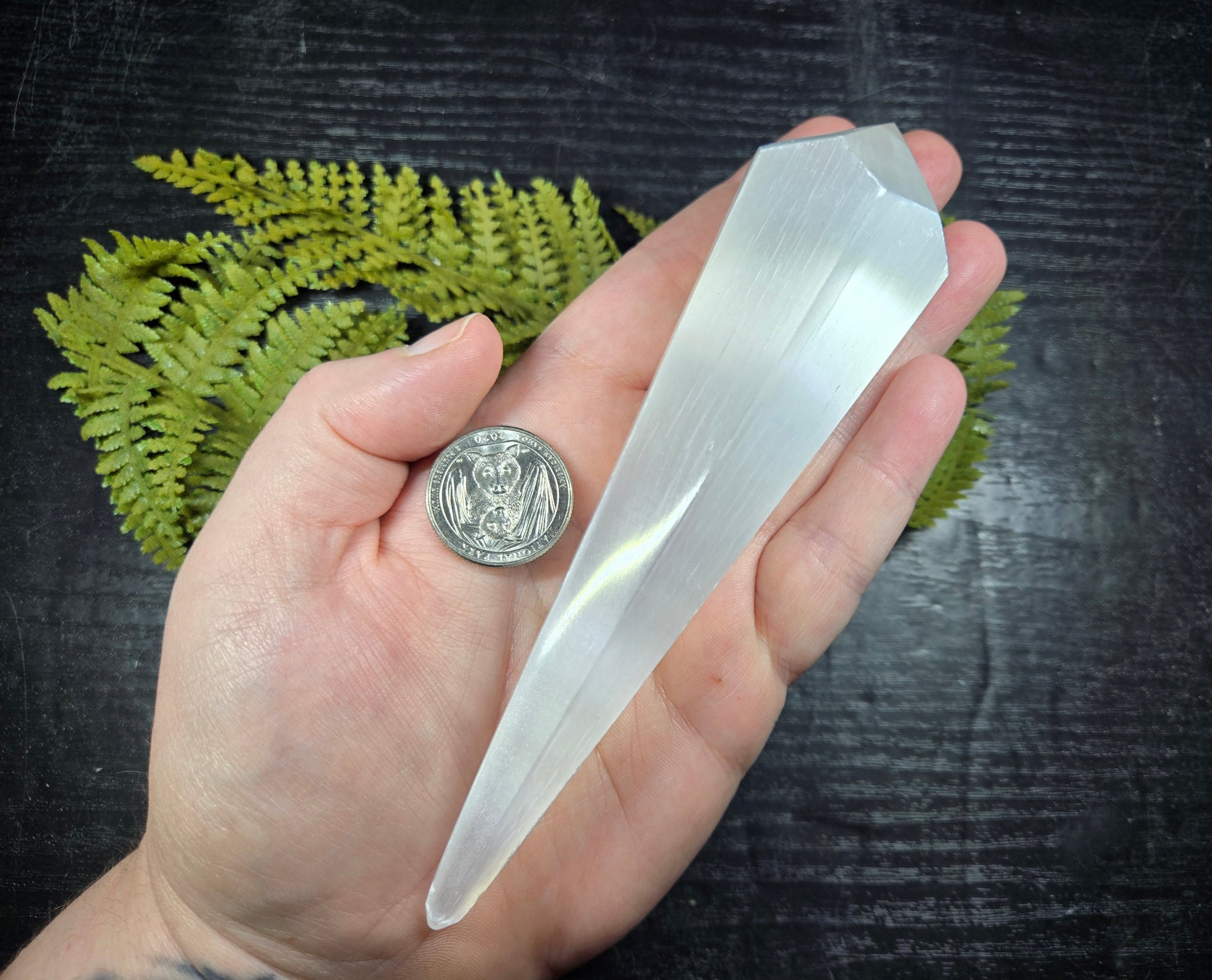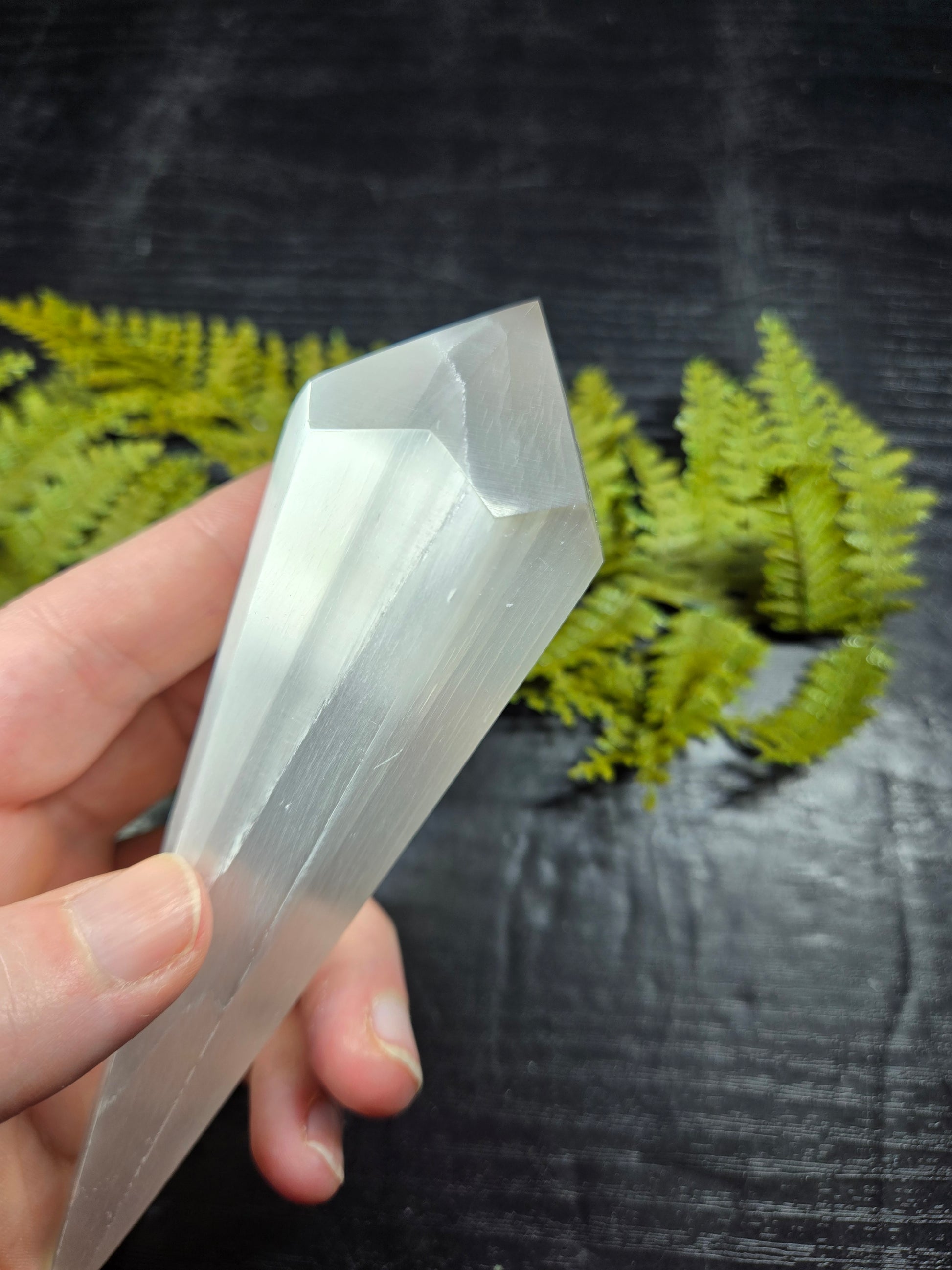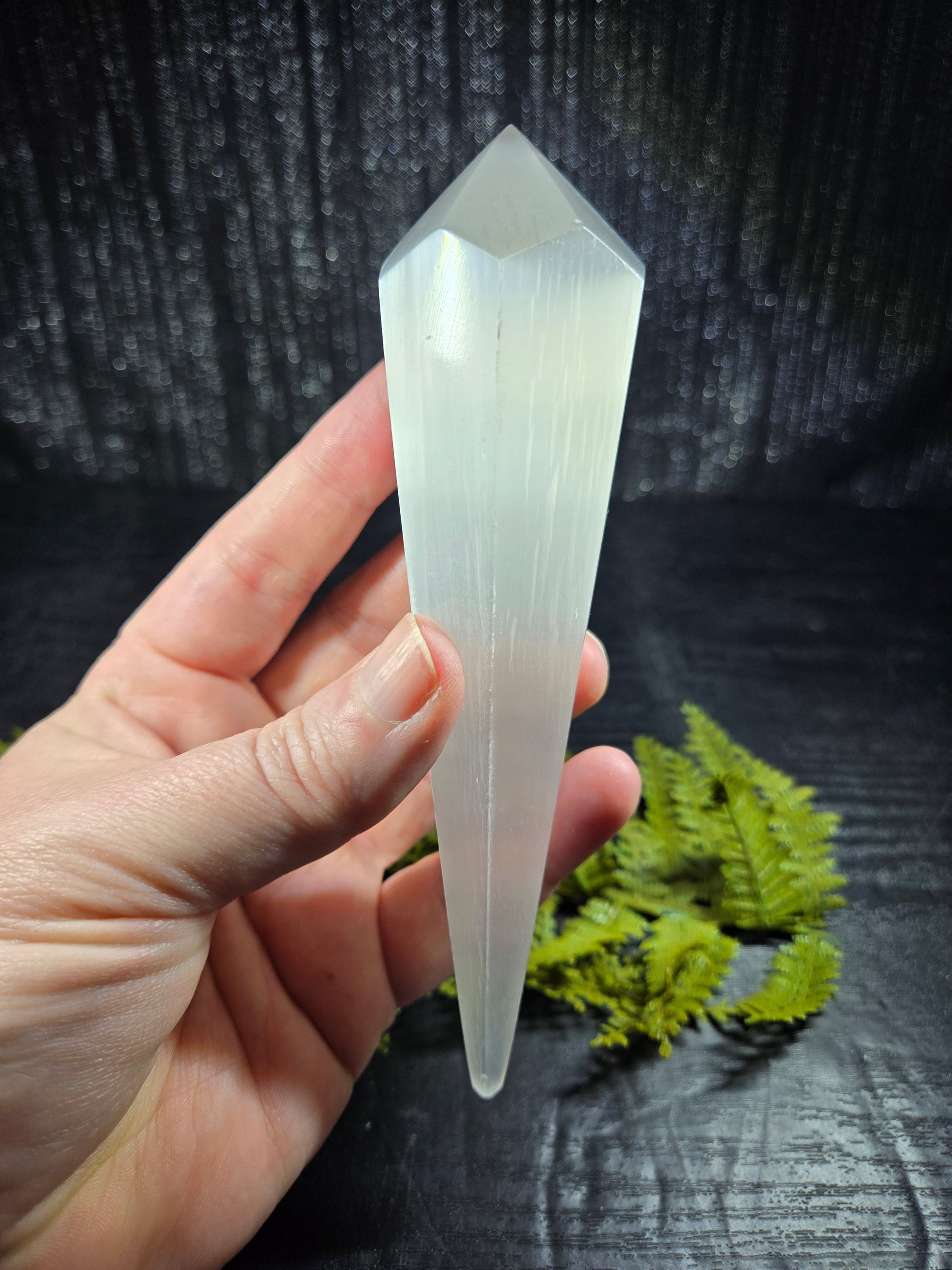 **WARNING: Avoid getting the wand wet. Prolonged exposure to moisture will degrade the polish and the crystal itself. Be mindful if the wand breaks to avoid breathing around the shards. Wear ppe when cleaning breakages from selenite
