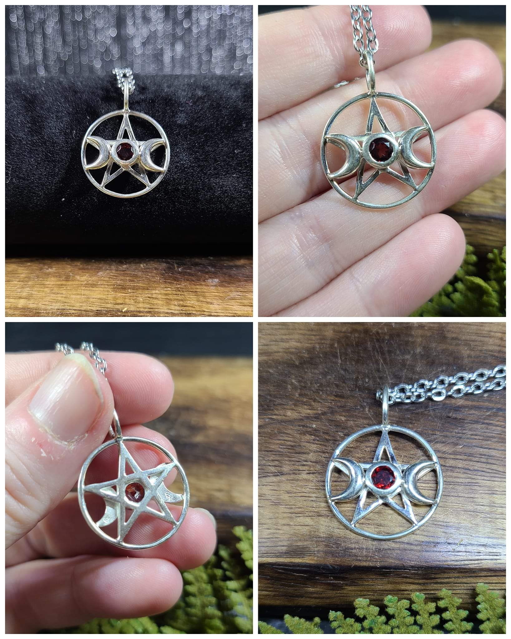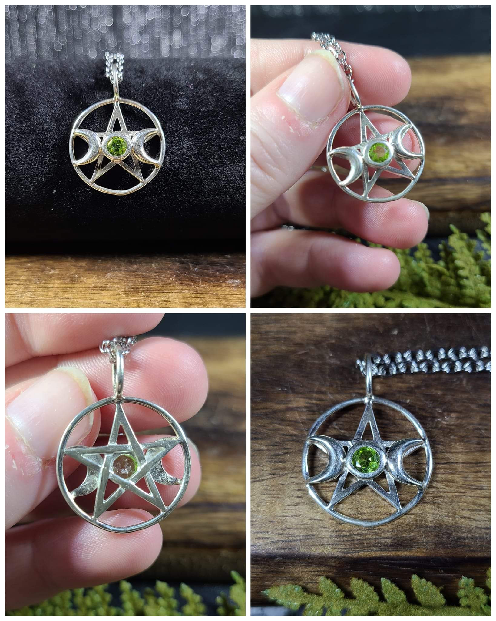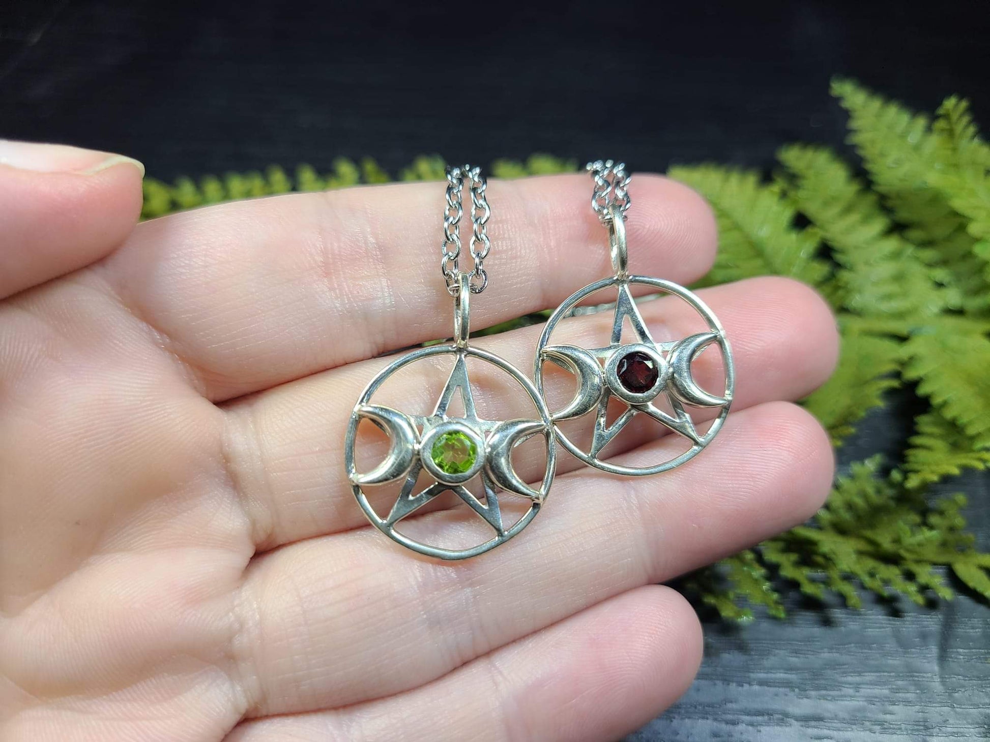 These are absolutely gorgeous, .925 Sterling silver Pentacles with triple moons and either a peridot or garnet embedded as the center piece.