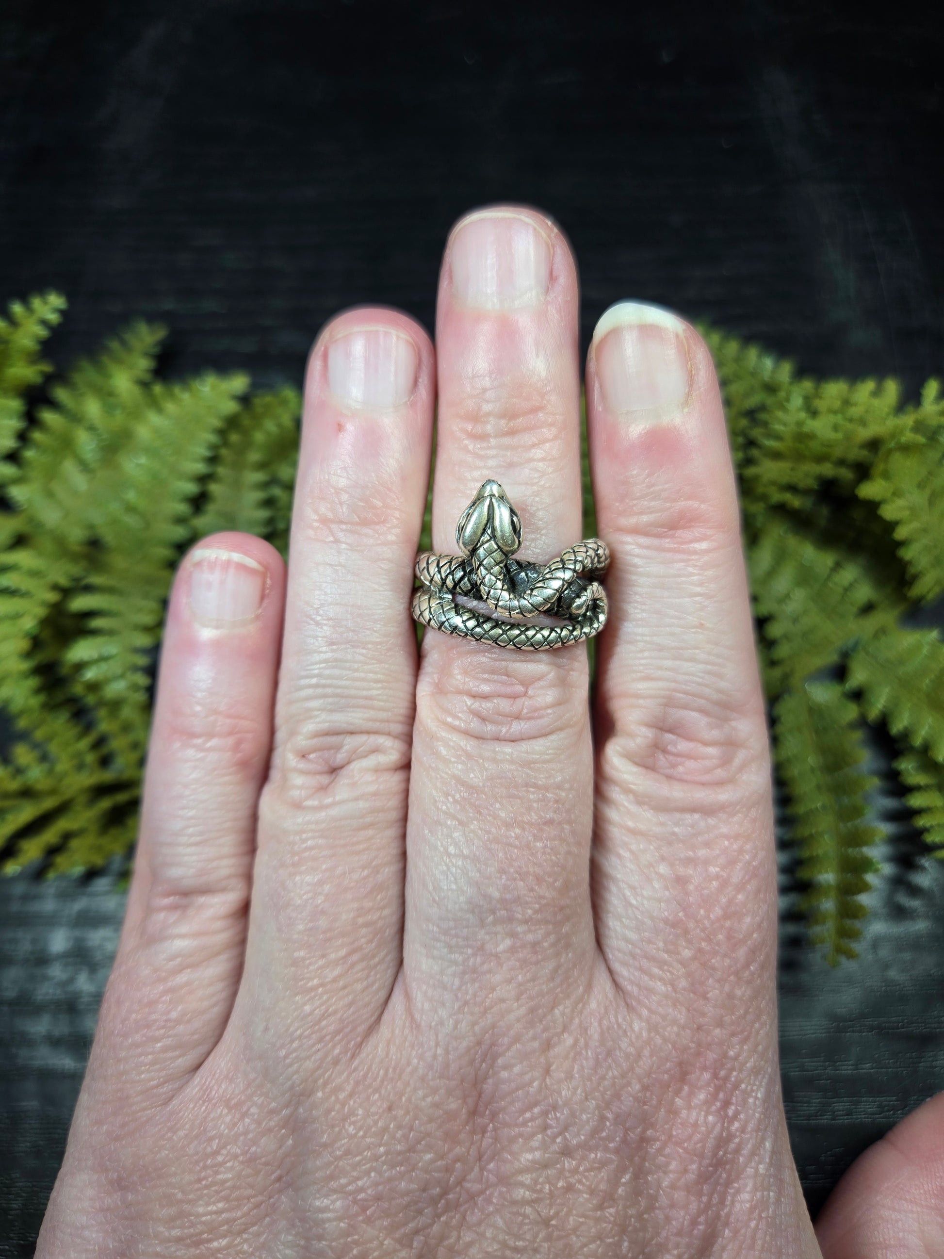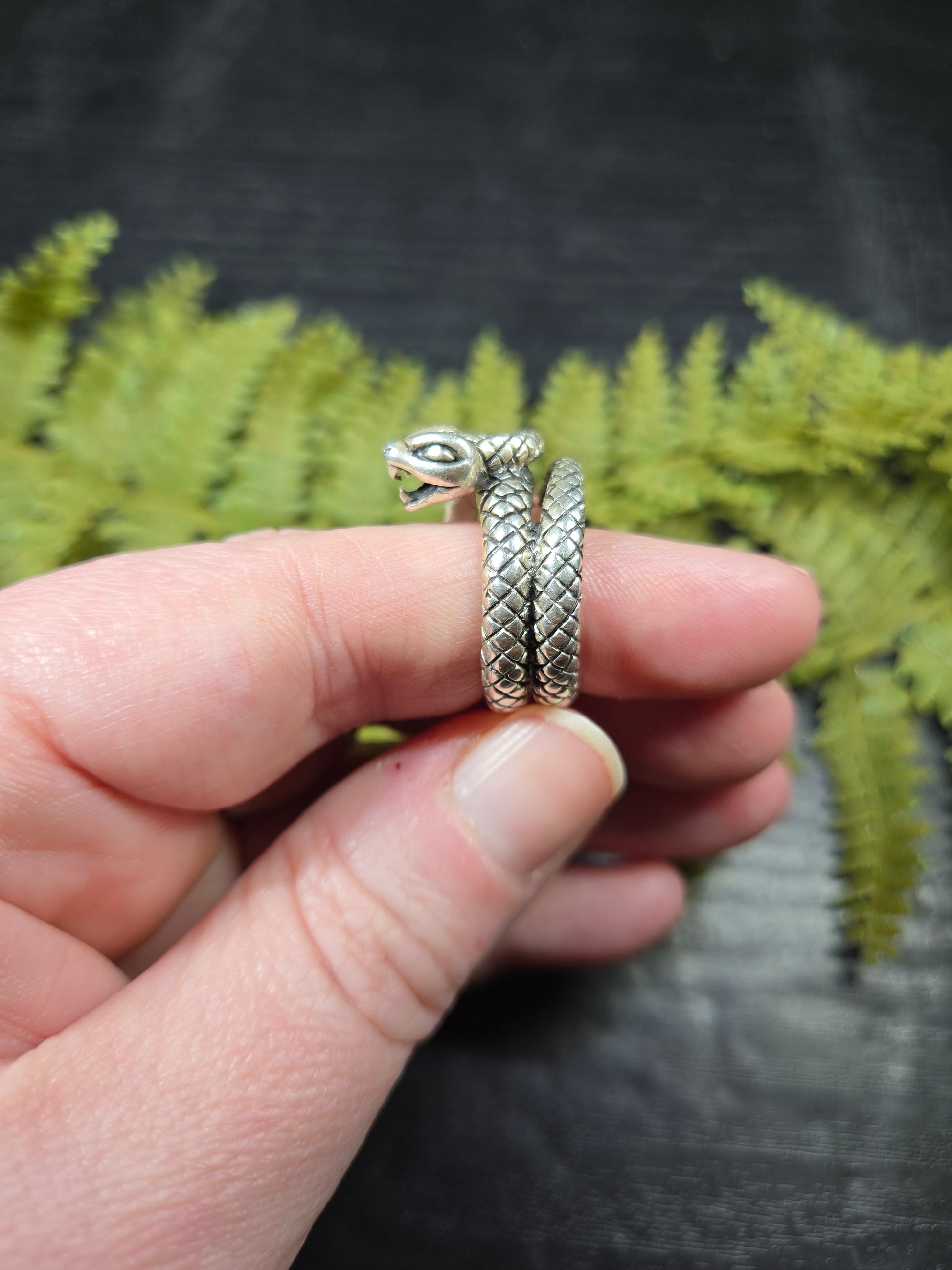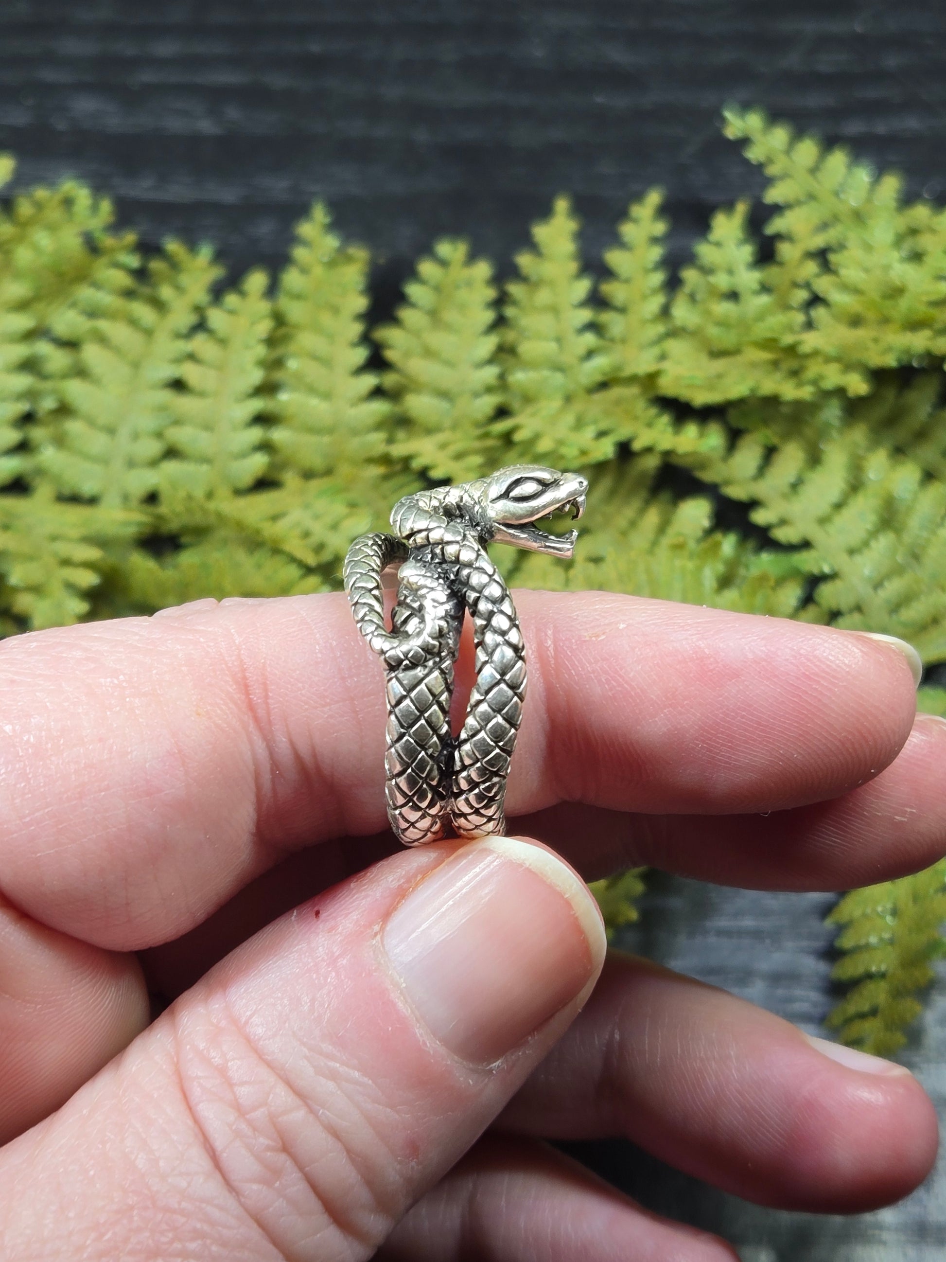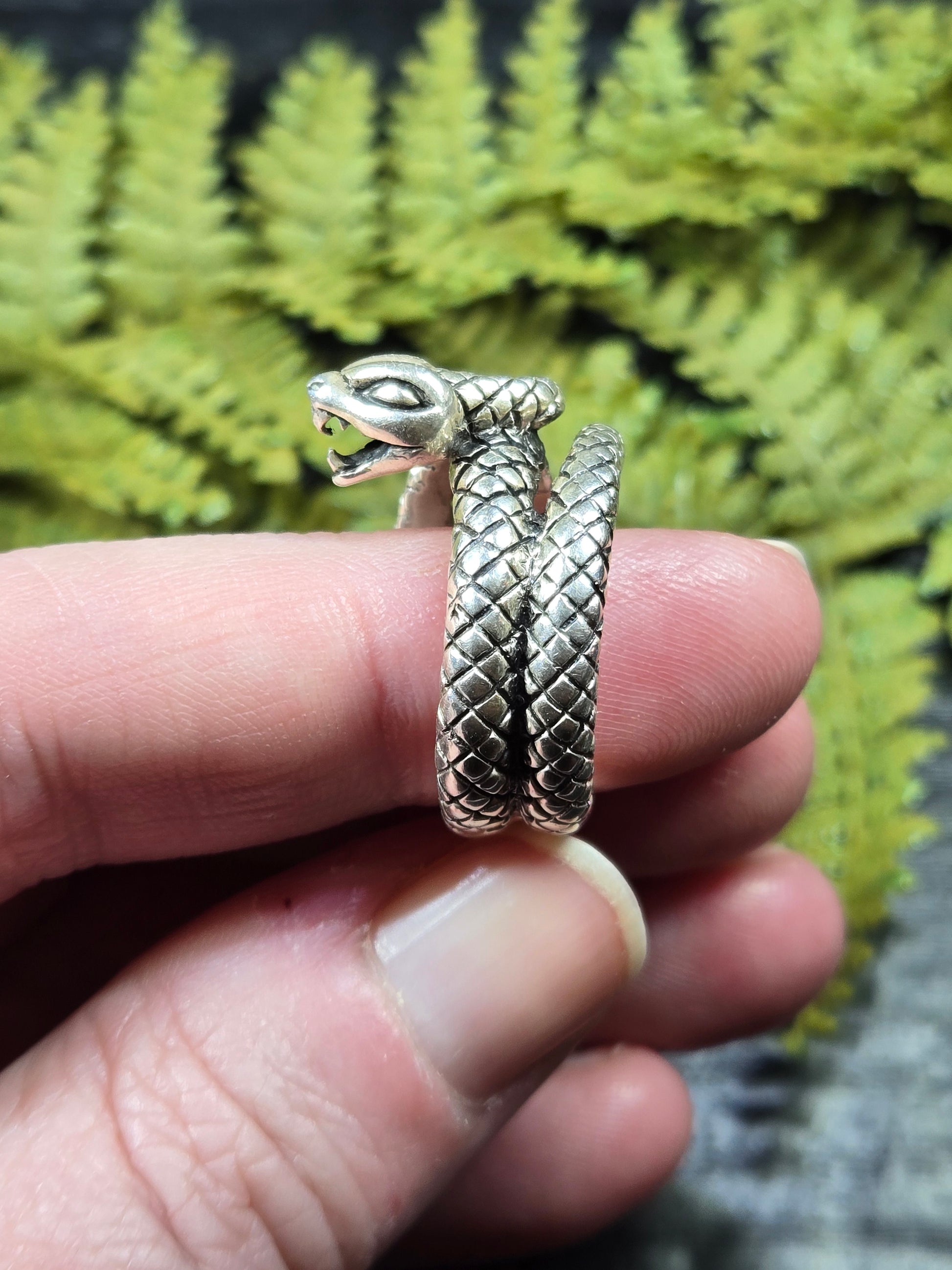 This ring is a stunning piece for those snake lovers out there. It is a snake with its mouth open wide, doubly wrapped around your finger. It is a gorgeous protection amulet, or just a stunning representation for our snake loving friends.