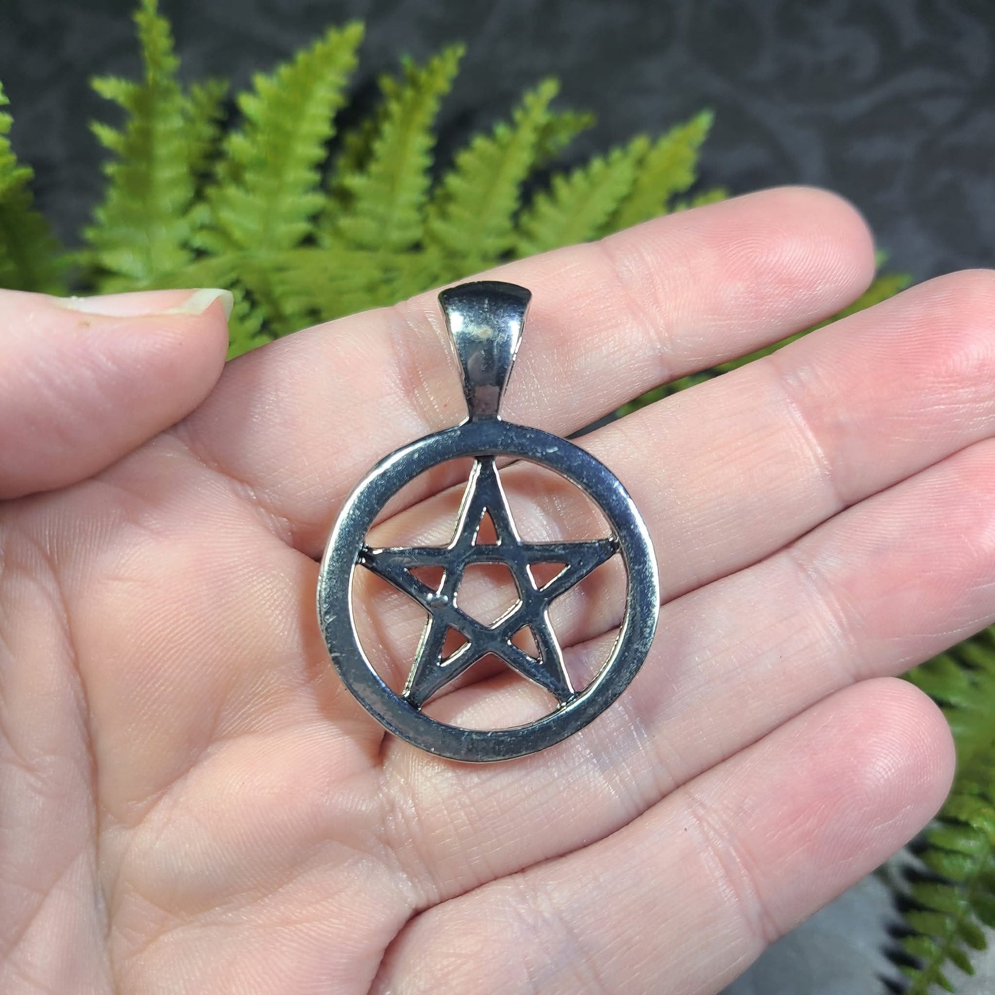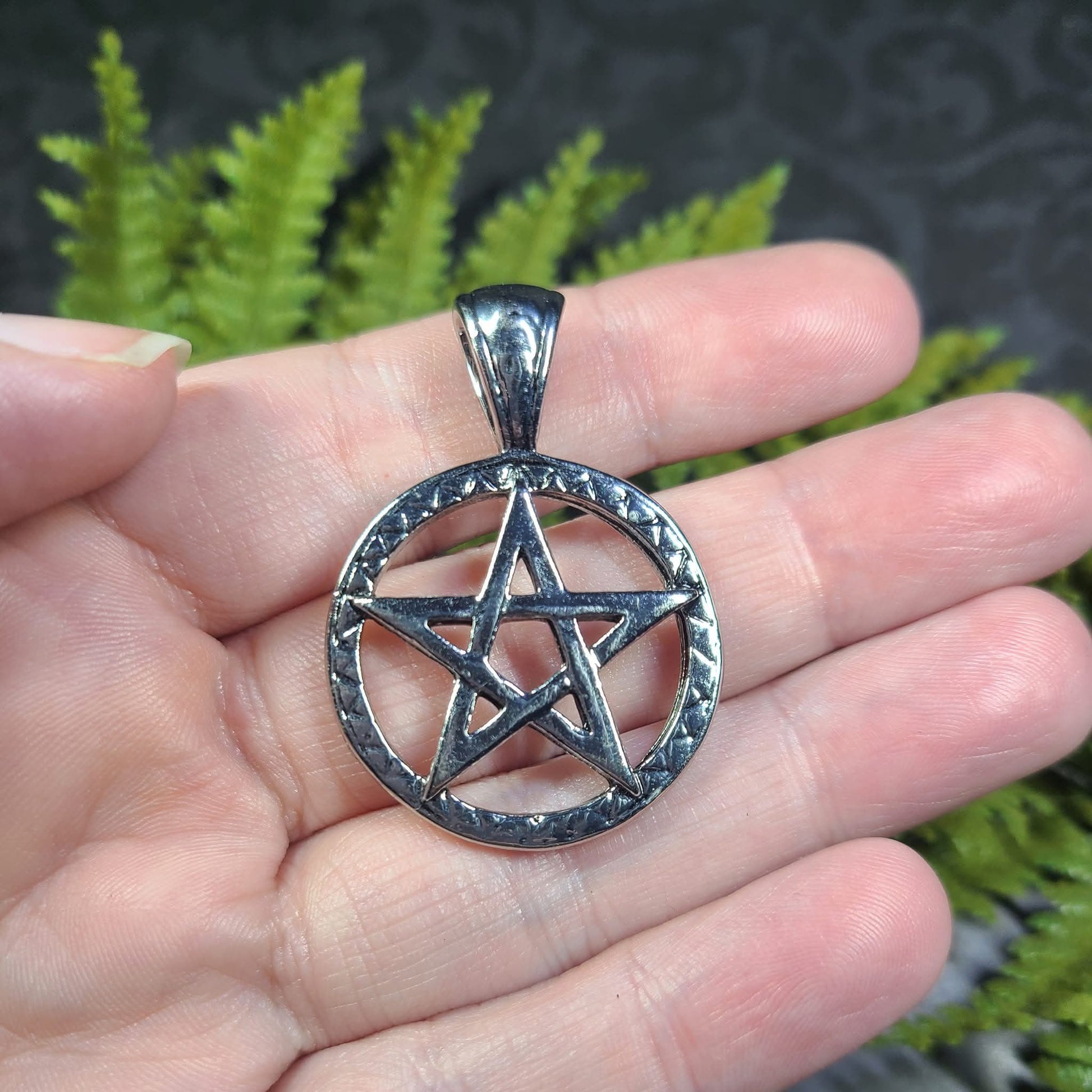 These are stainless steel pentacles with one plain side and one stamped/etched with a braid-like pattern. Looking for a bolder, or more masculine option for a Pentacle? This is perfect!