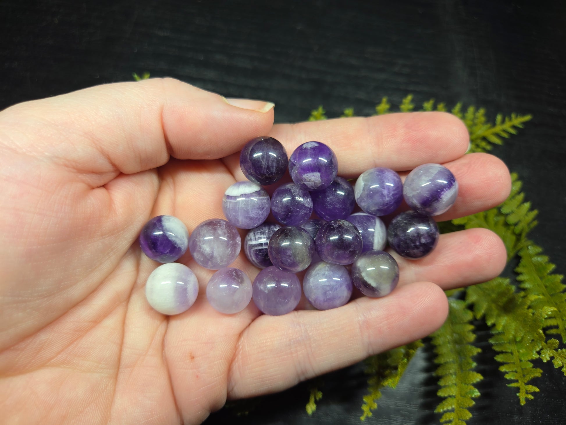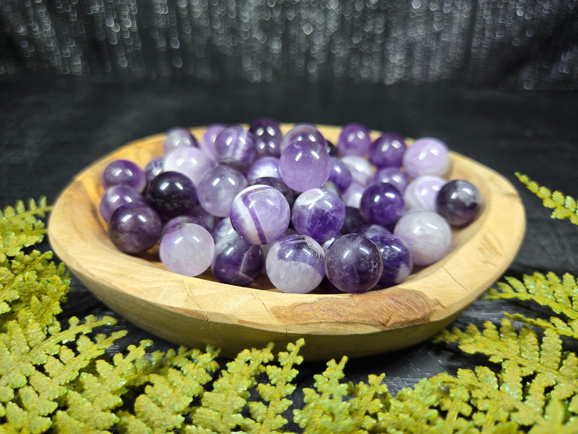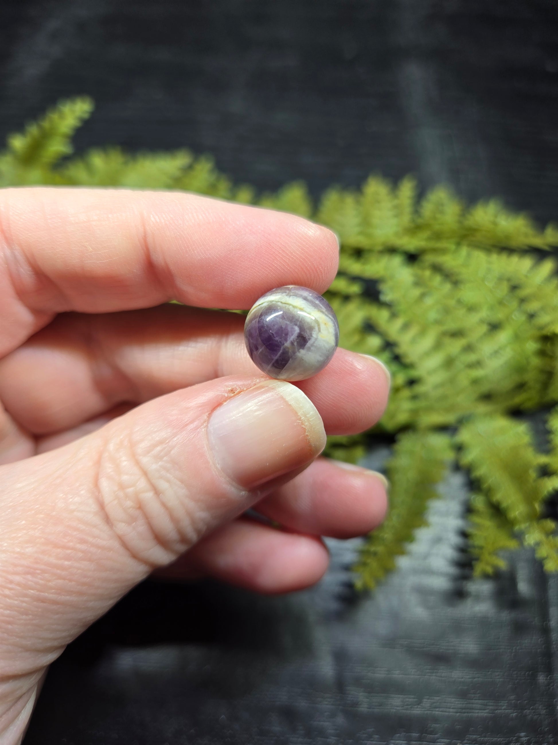 These gorgeous little chevron/dream Amethyst spheres are like little bits of purple caviar ready for your crafting or decorating! Add them to your altar or spells to promote health and help with addictions (especially drinking), or use in your plants/terrariums for a burst of colour.
