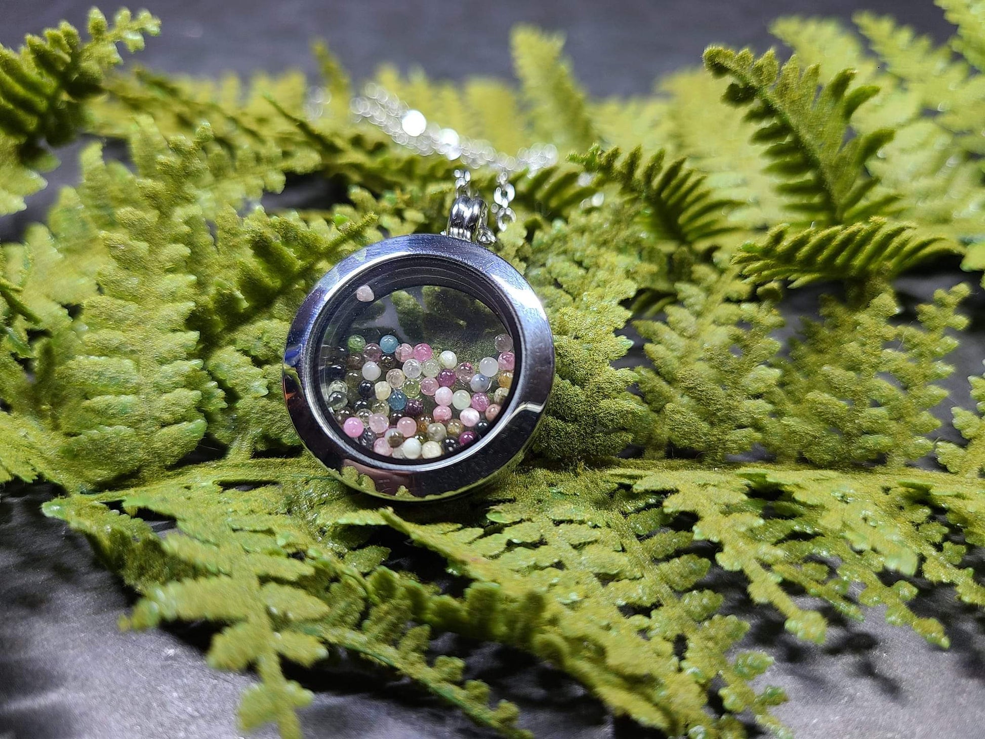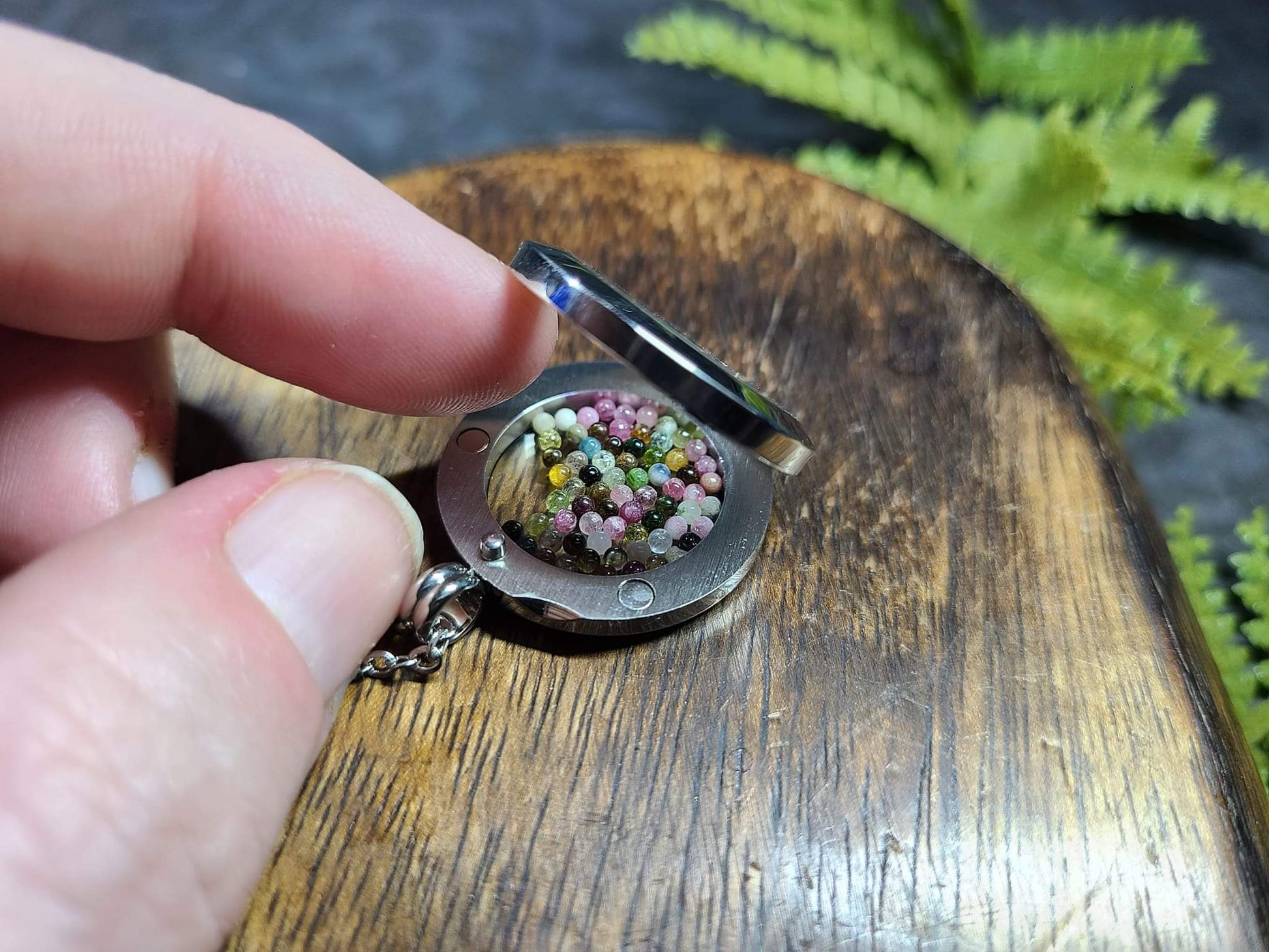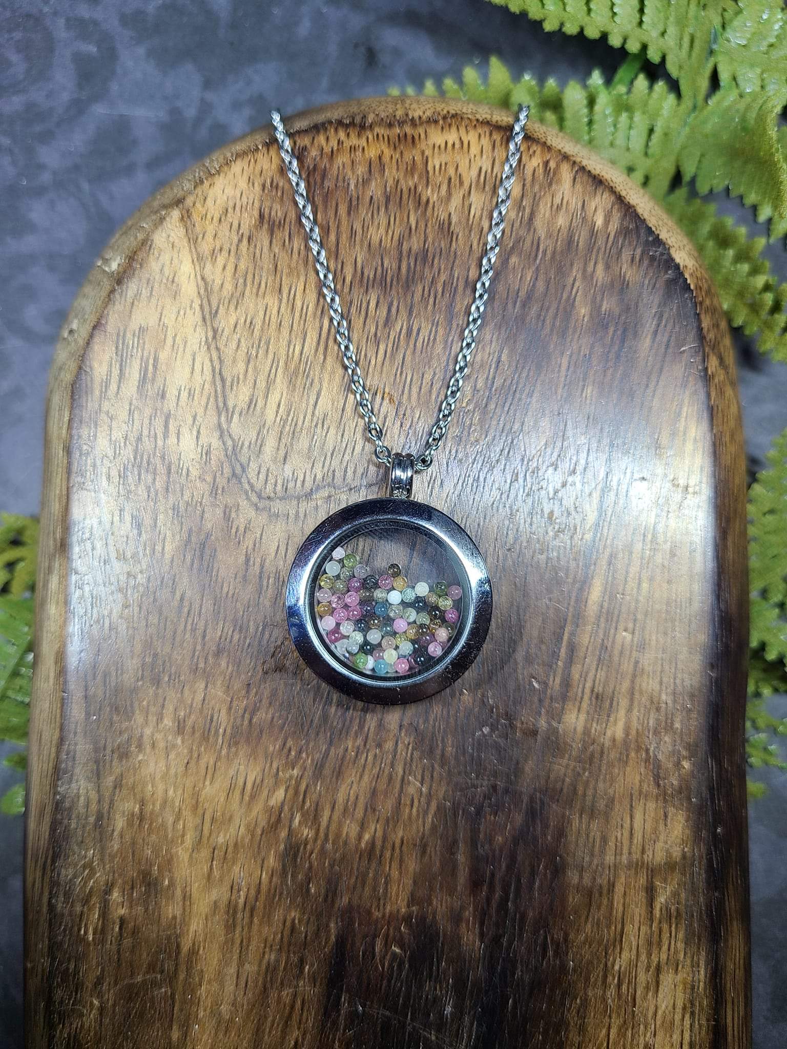 Here we have a very cool locket style necklace! These are stainless steel and glass lockets closed by really strong magnets. They house tiny pearls of high polished mixed tourmalines! Please be mindful when opening the locket, as these pearls of tourmaline are smaller than seed-style beads!